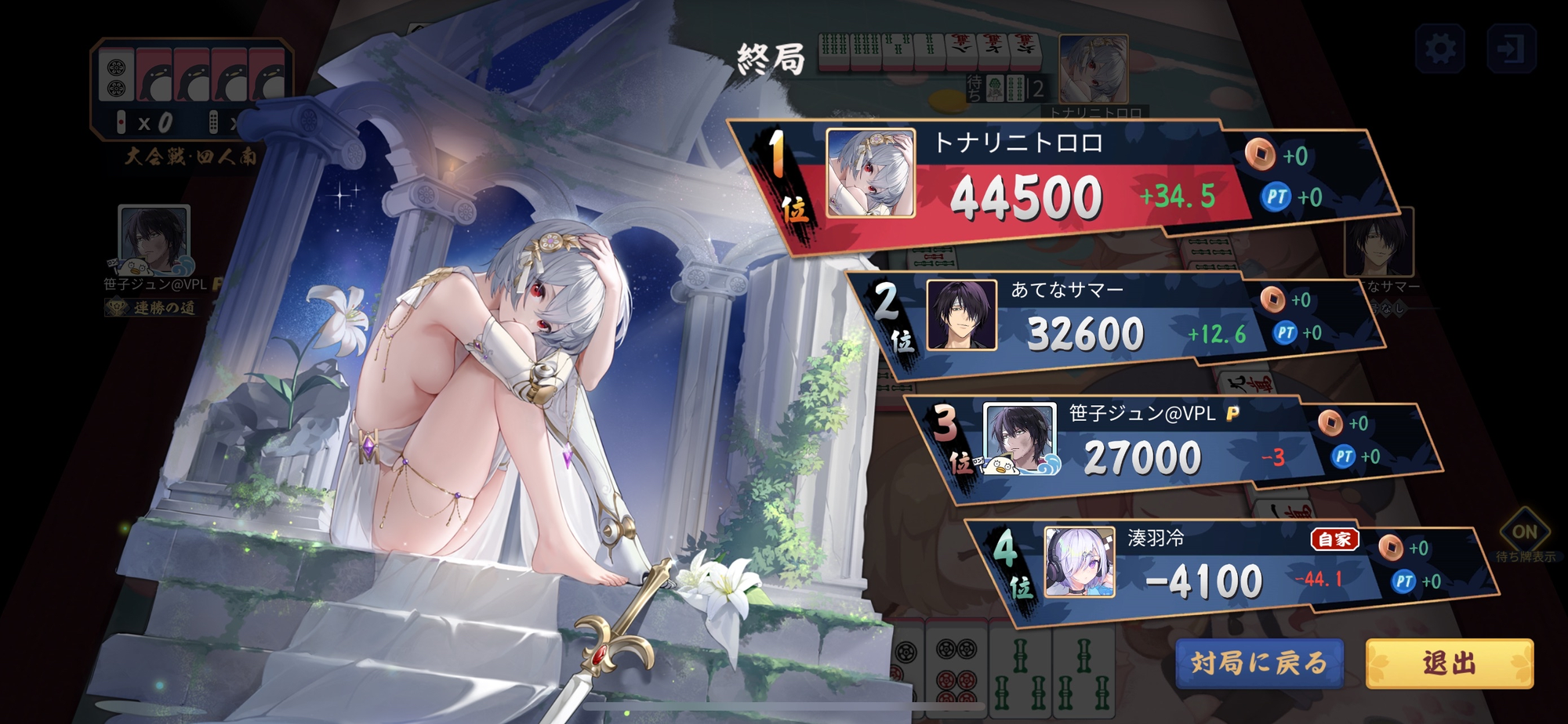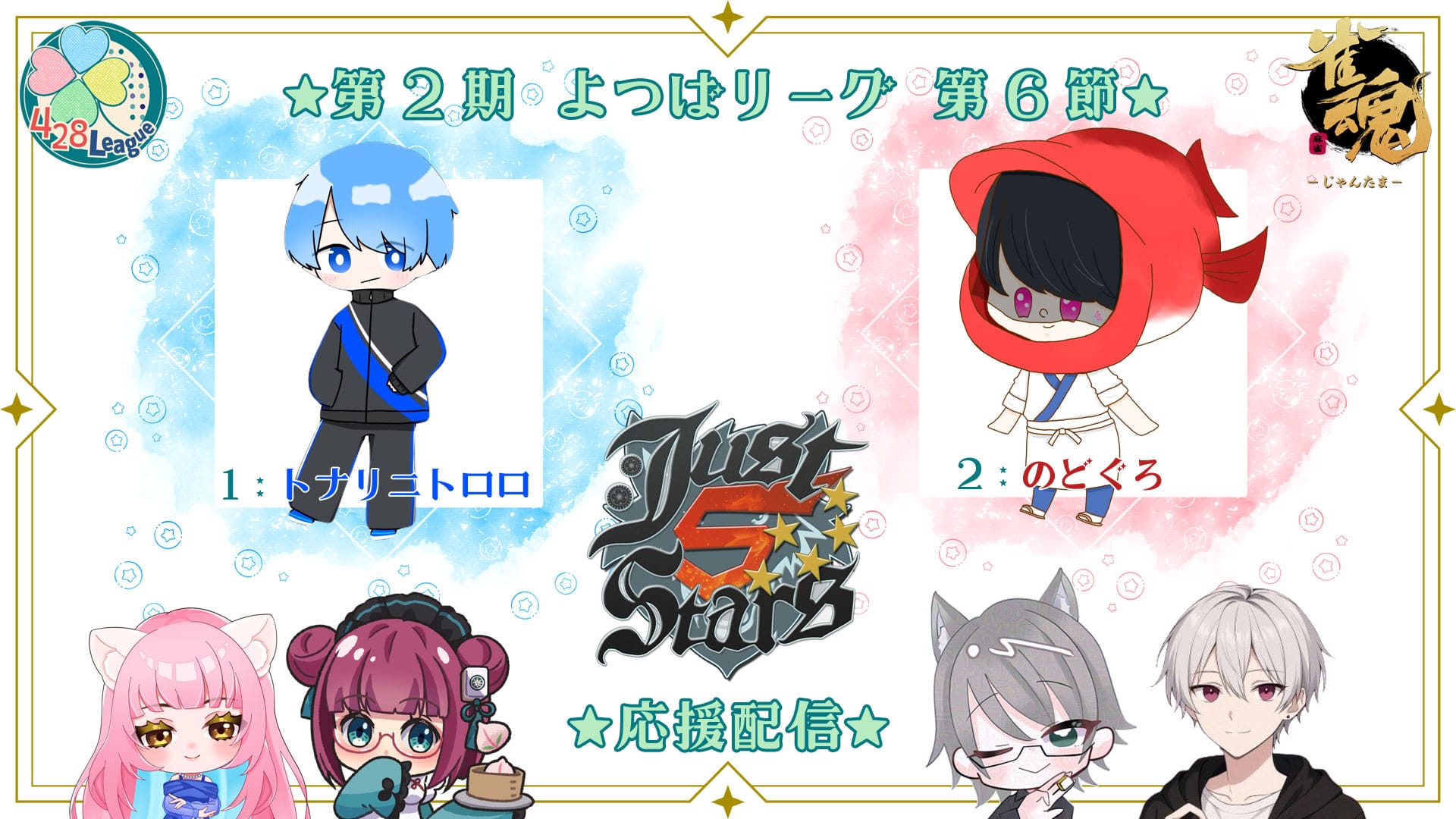 並びは月冴音類選手(Vivace!)・ANOTOKO選手(Jongsemble)・ハヤブサ選手(White Devils)・あさひなひなた選手(428League)の順に。