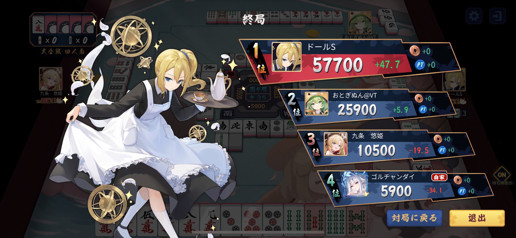 オーラスはドール選手がおとぎぬん選手から1000の出アガリを決め、自らトップを確定させ終局となった。