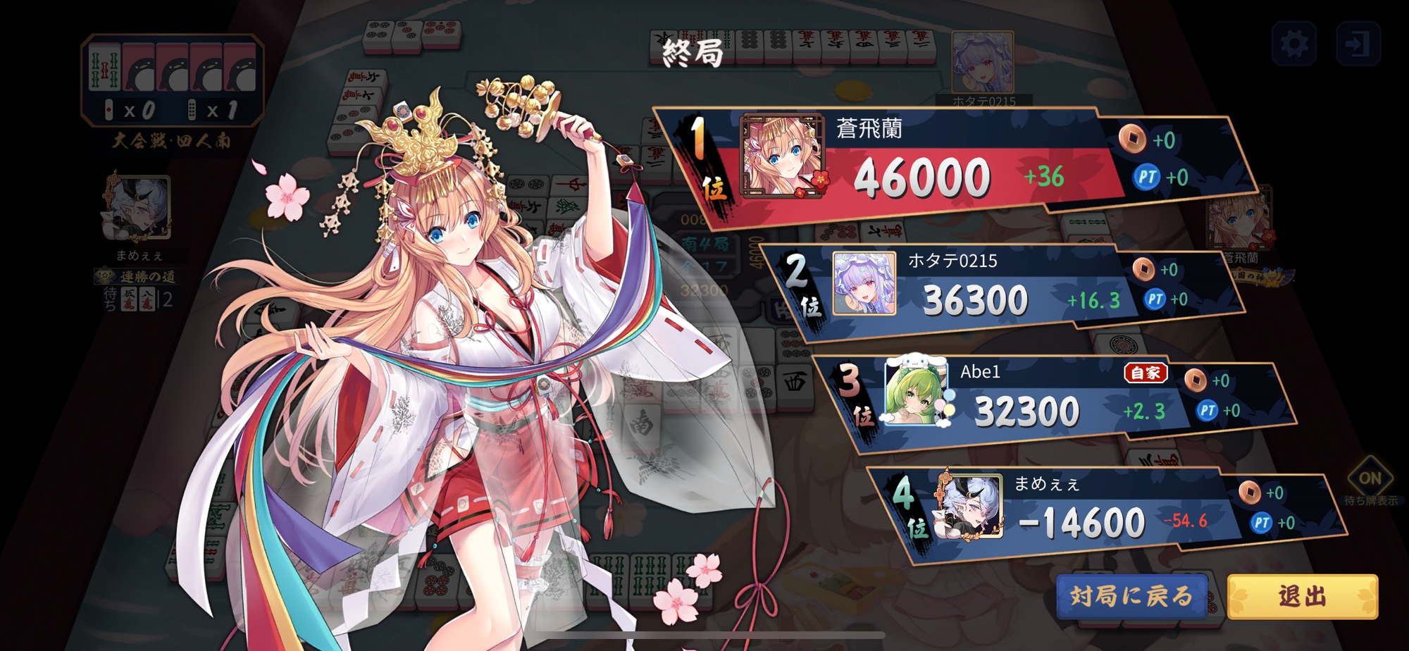 南1局は蒼飛蘭選手がすいこ選手から満貫を出アガるが、南2局はあべ選手・のどぐろ選手の2人テンパイで流局。
