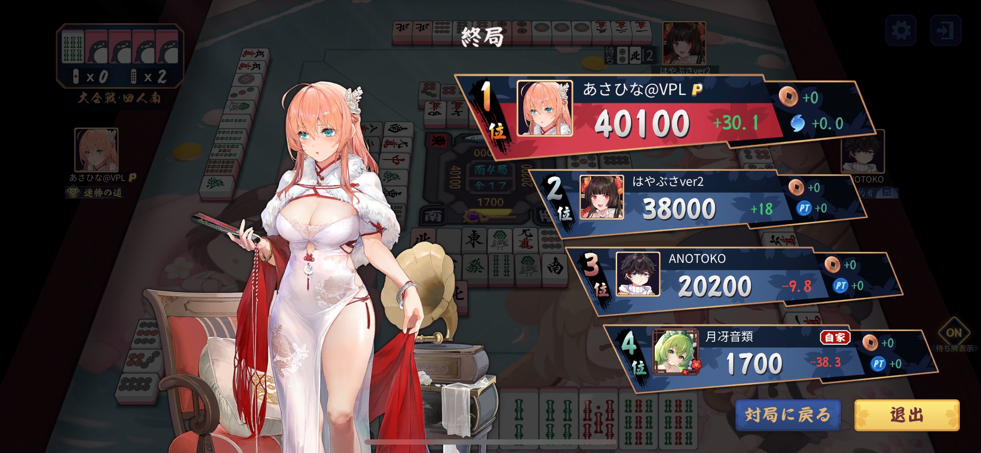 3本場ではおとぎぬん選手がドール選手から満貫の出アガリに成功。