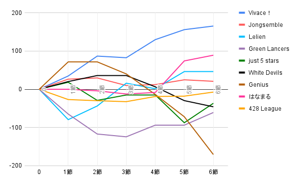1本場ではあてな選手に5200は5500を放銃するが、オーラスは湊羽冷選手から1000の出アガリを決めて見事トップを獲得した。