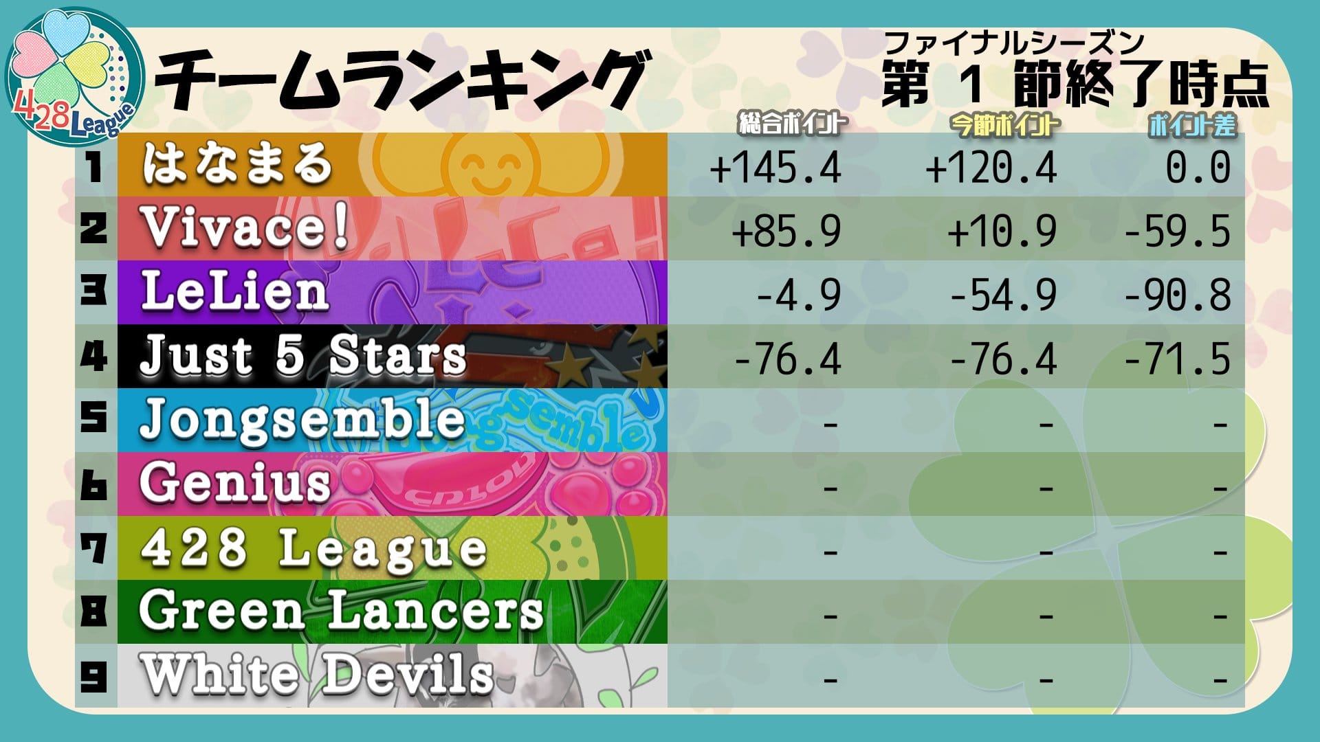 次節ファイナルシーズン最終節の第3節は1月29日(木)21時より行われ、ついに第2期の優勝チームが決定する。