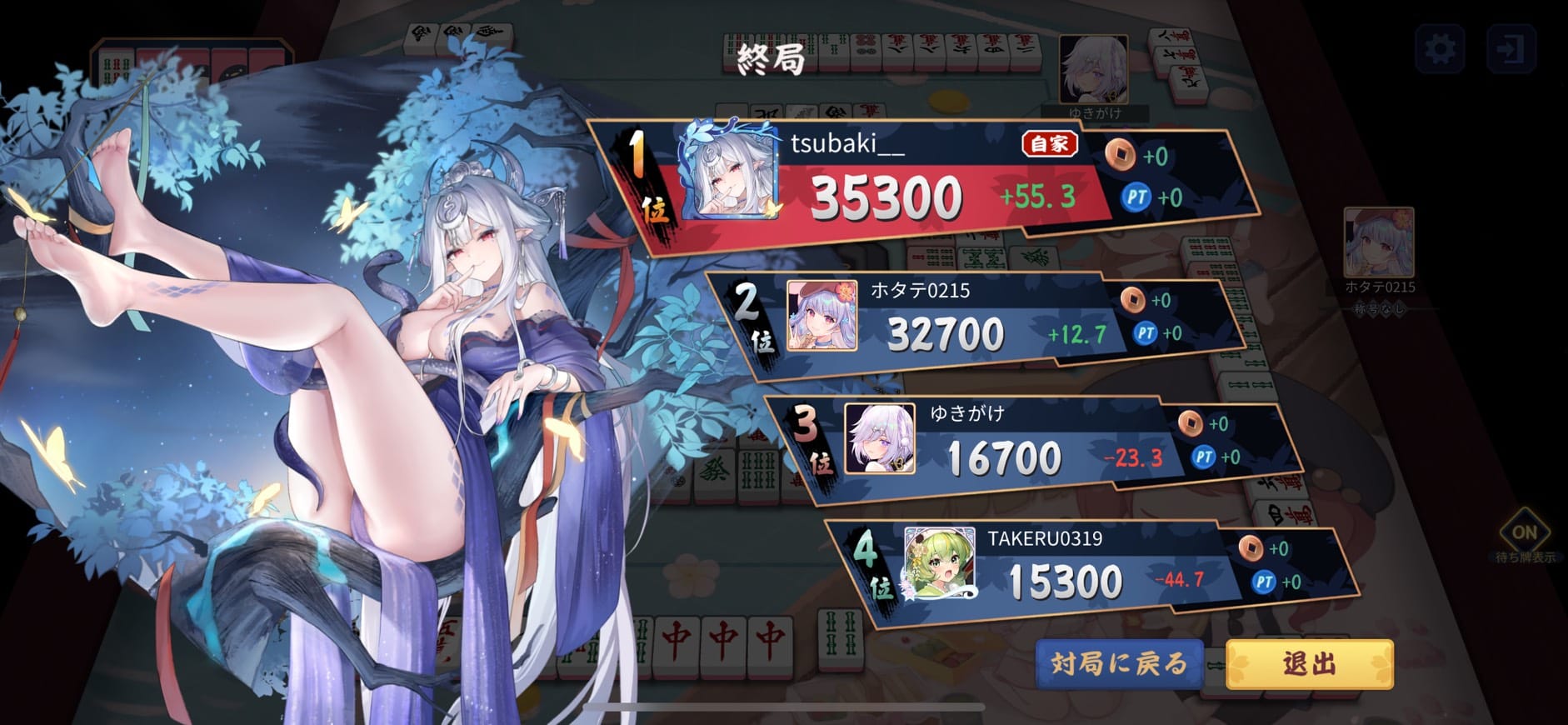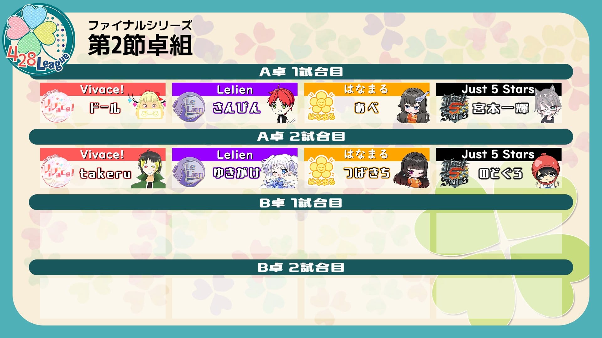 席順は起家からつばきち選手(はなまる)・のどぐろ選手(Just 5 Stars)・ゆきがけ選手(Lelien)・takeru選手(Vivace)の並びに。
