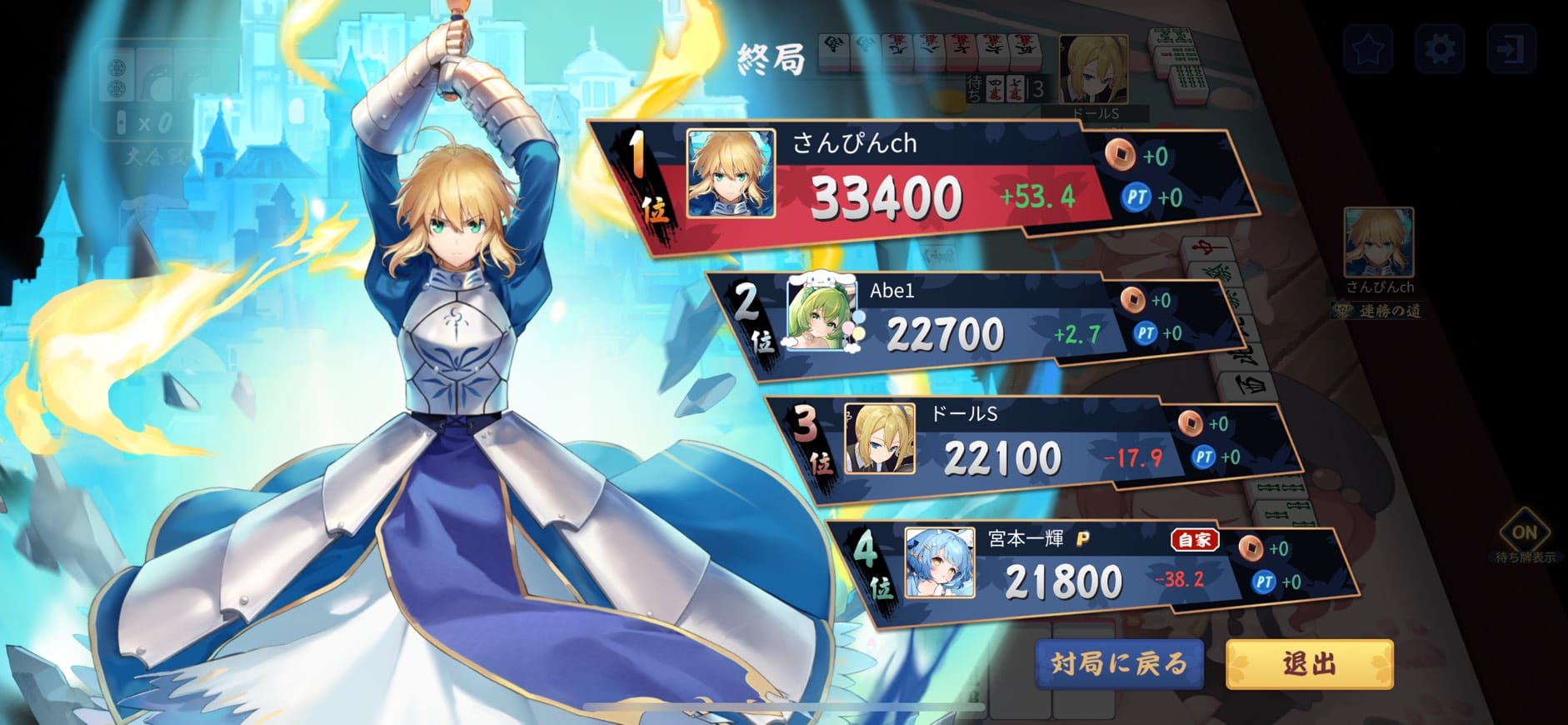 席順は起家からドール選手(Vivace)・あべ選手(はなまる)・宮本一輝選手(Just 5 Stars)・さんぴん選手(Lelien)の並びに。