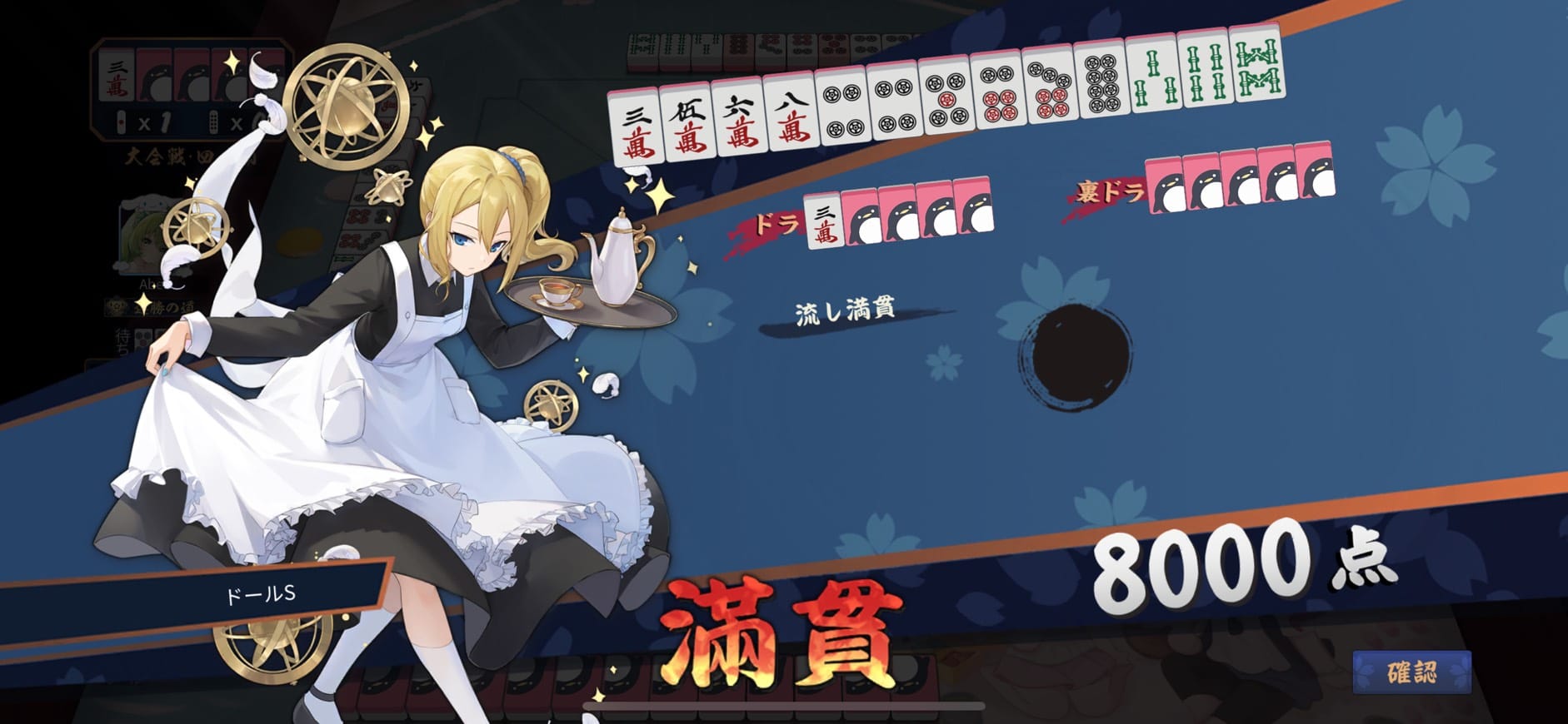 東1局、さんぴん選手がドール選手から3900の出アガると、続く東2局で満貫のツモアガリ。