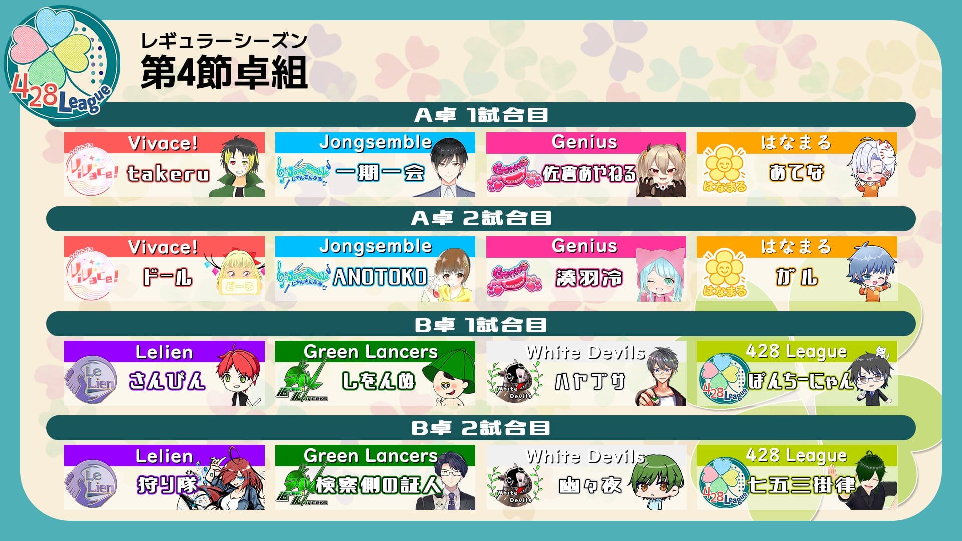 並びは湊羽冷選手(Genius)・ドール選手(Vivace!)・ANOTOKO選手(Jongsemble)・ガル選手(はなまる)に。