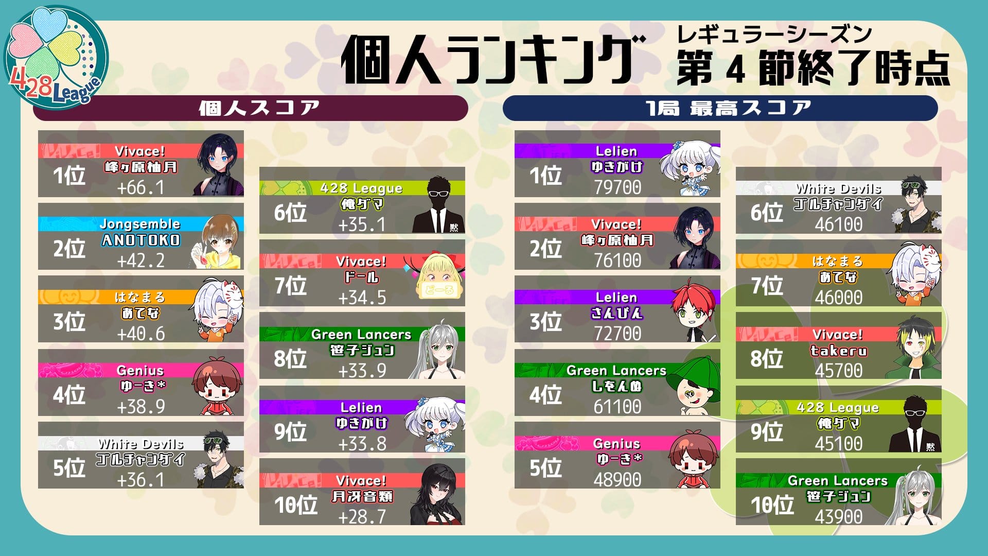 並びはさんぴん選手(Lelian)・ハヤブサ選手(White Devils)・しをんぬ選手(Green Lancers)・ぽんちーにゃん選手(428League)に。