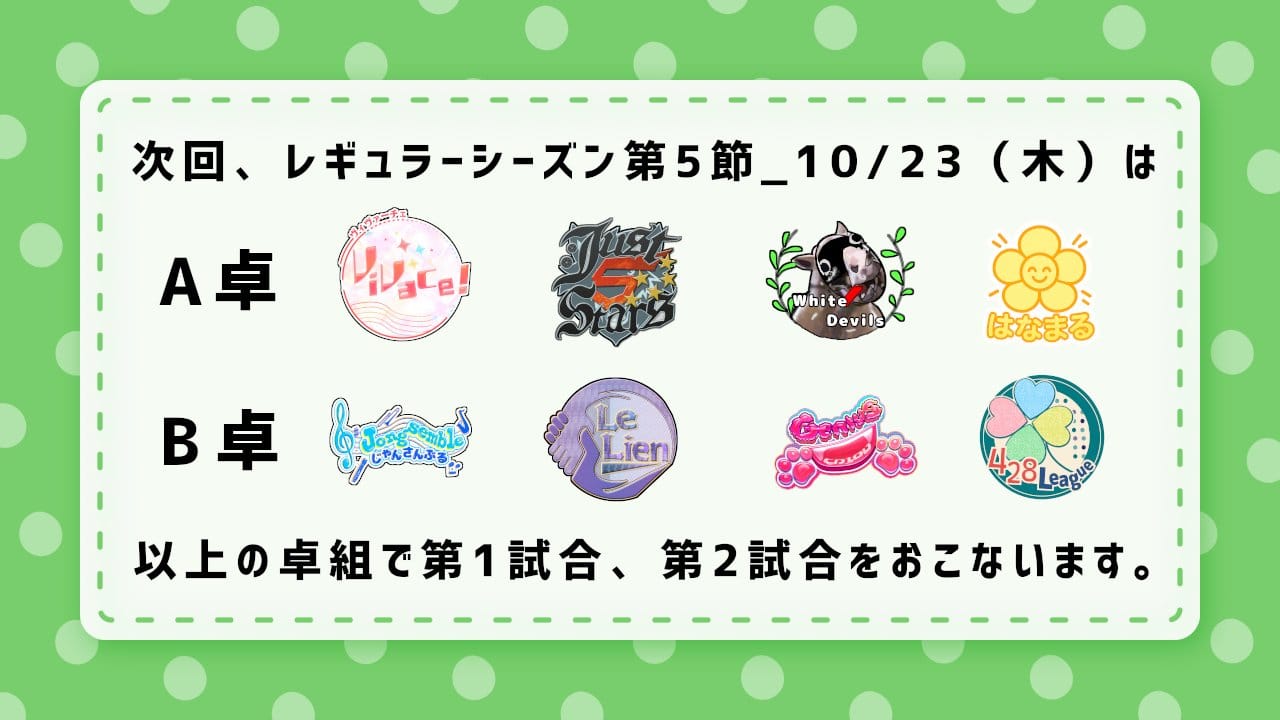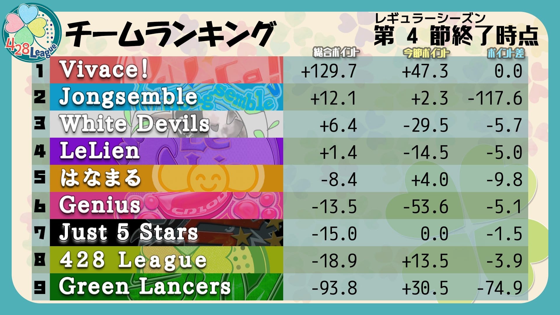 第4節は、Just 5 Starsが抜け番となり、残る8チームで試合が行われた。