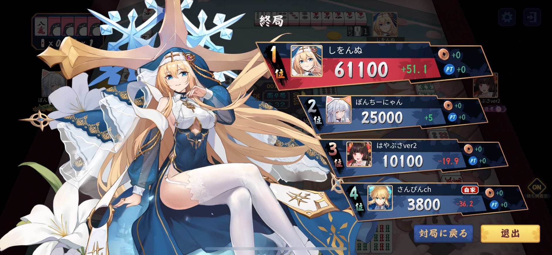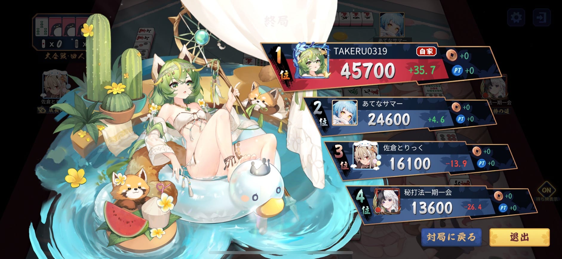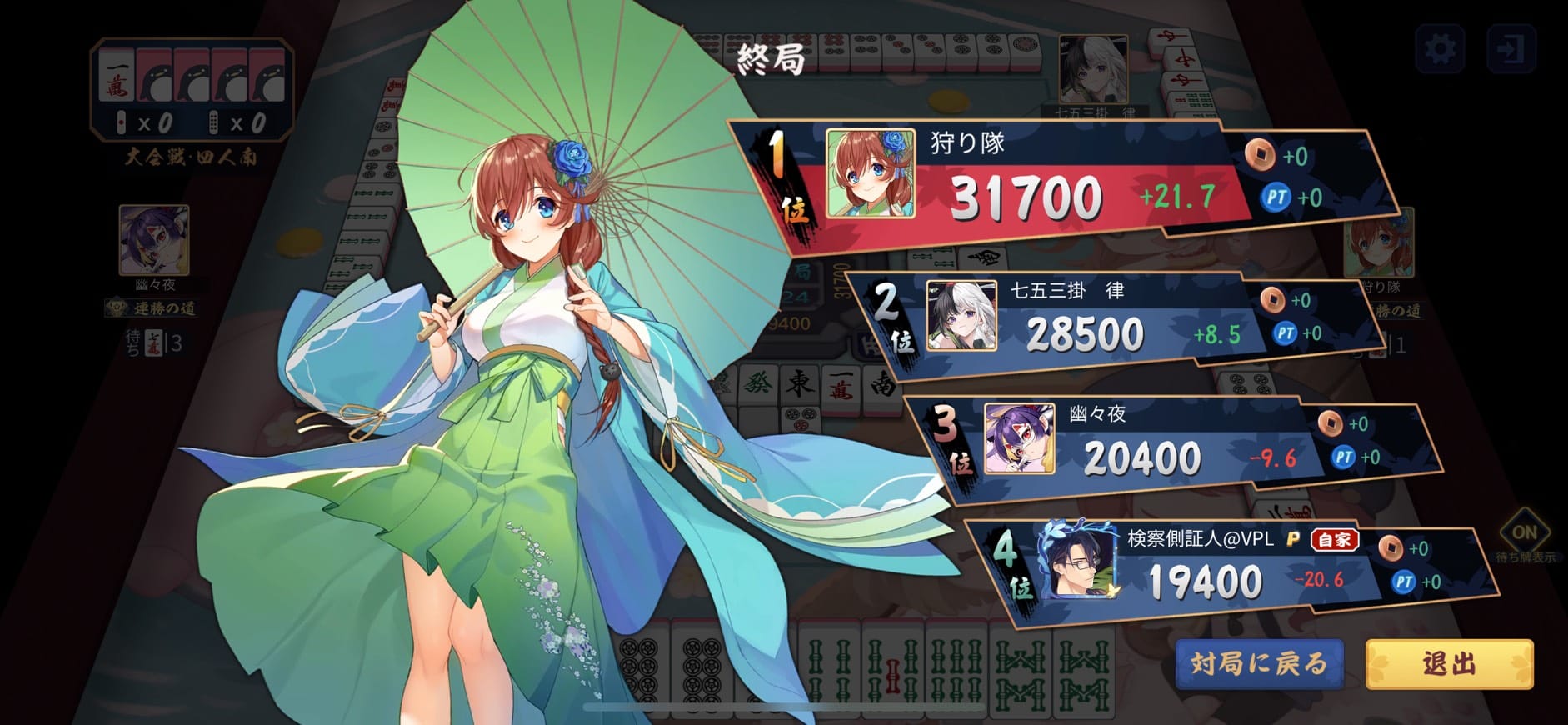 4本場で幽々夜選手から3900は5100を出アガると、南4局で再び幽々夜選手から2000をアガリ終局。