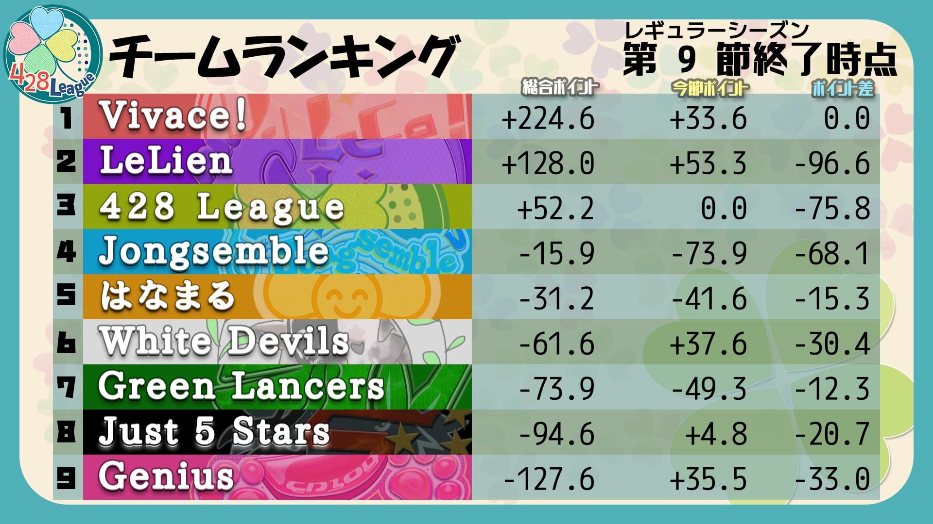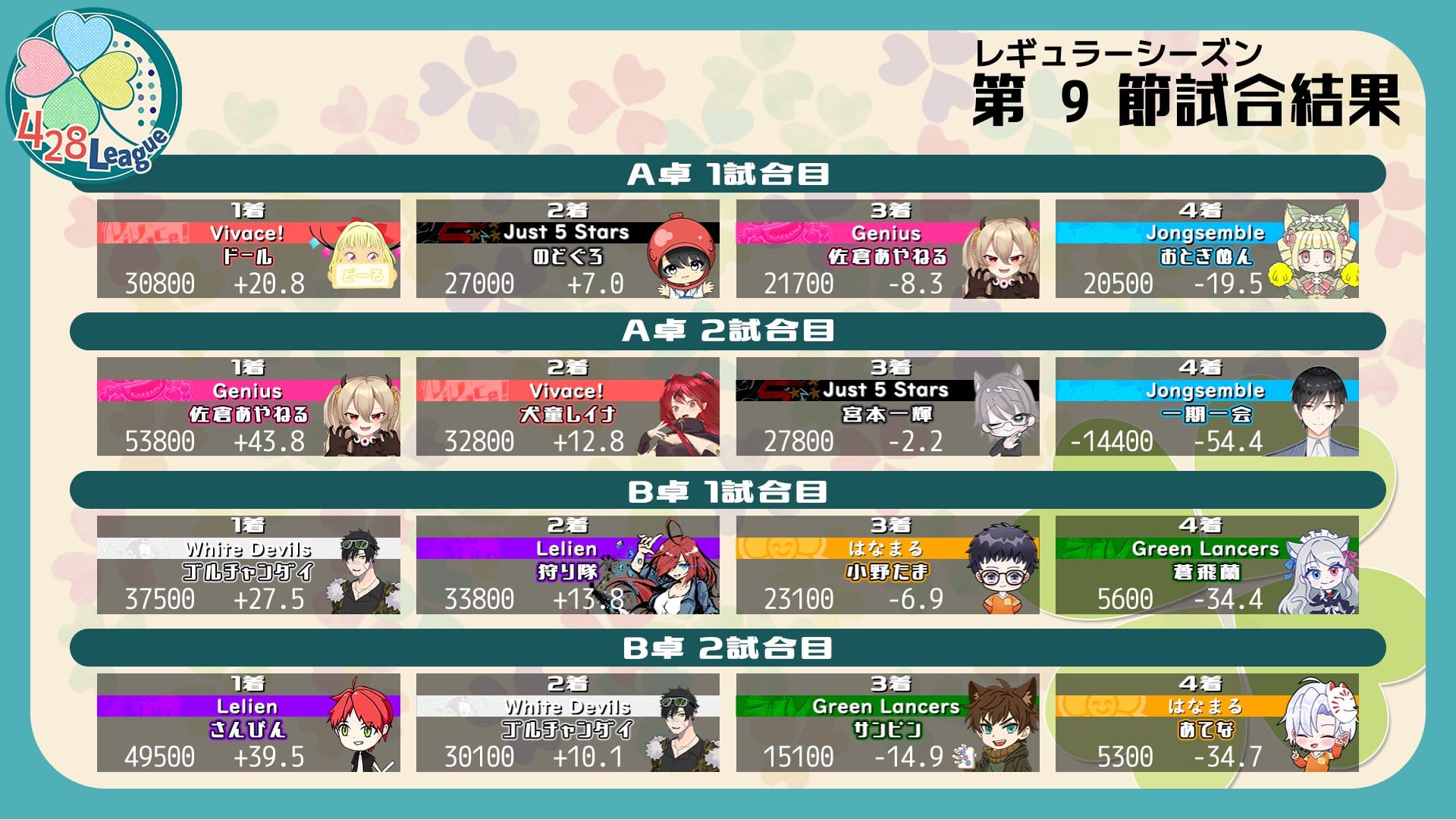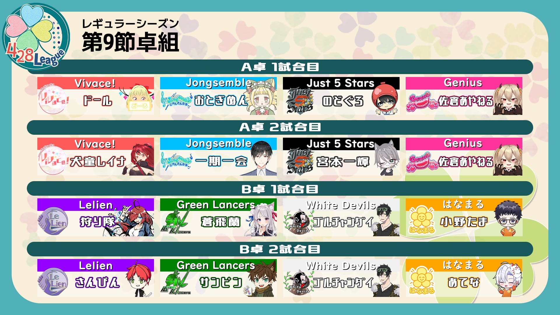 第9節は、428Leagueが抜け番となり、残る8チームで試合が行われた。