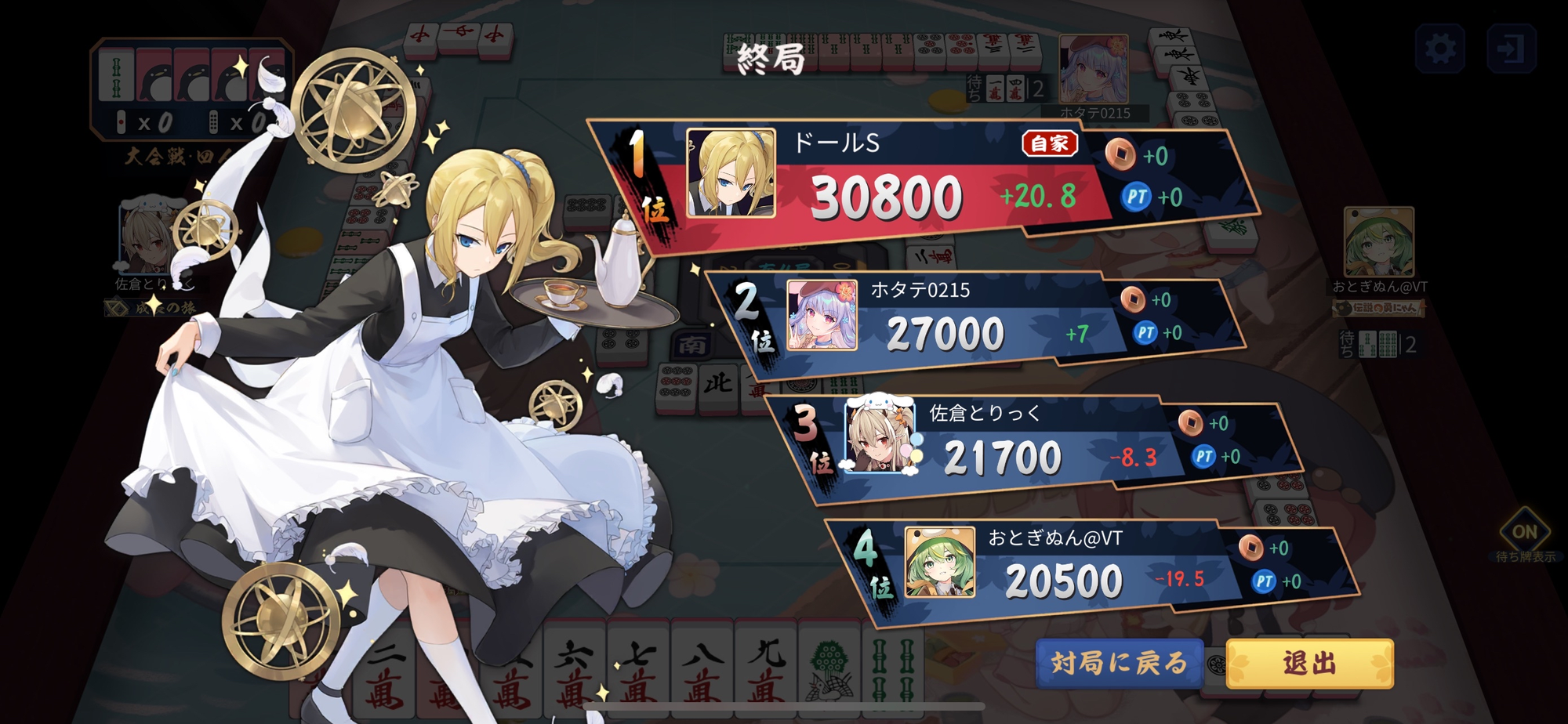 並びは起家からドール選手(Vivace!)・おとぎぬん選手(Jongsemble)・のどぐろ選手(Just 5 Stars)・佐倉あやねる選手(Genius)。