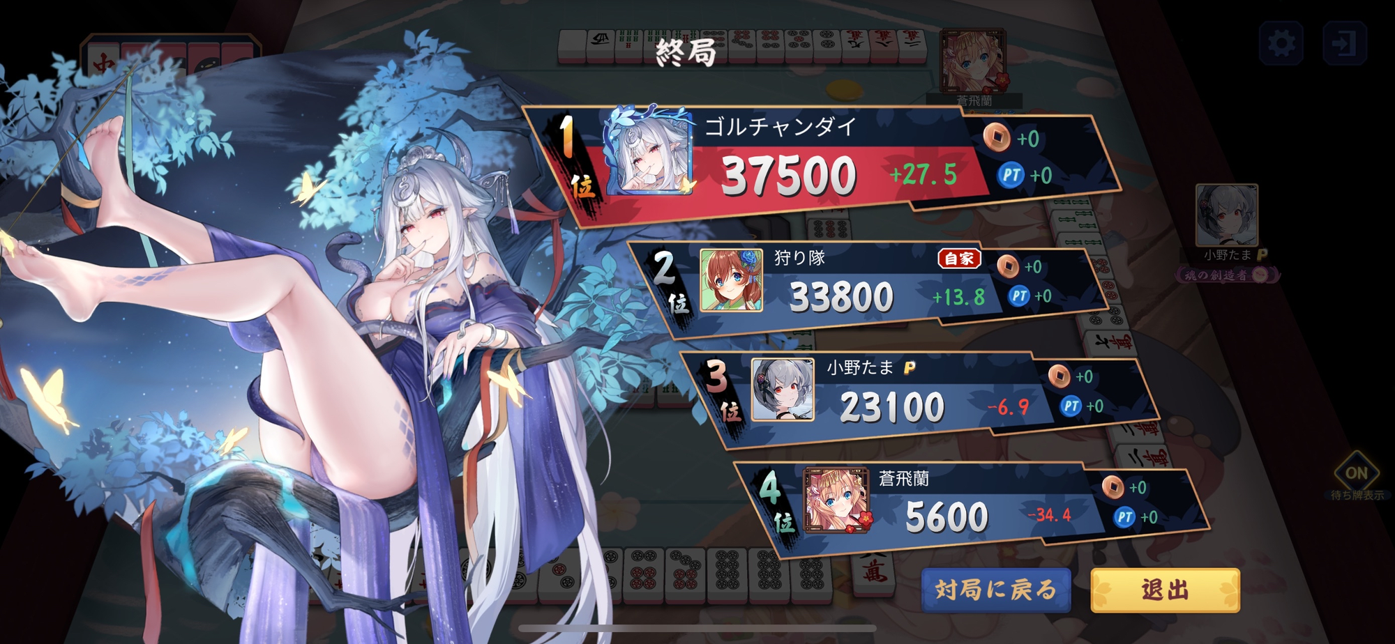 結果は蒼飛蘭選手が当たり牌を掴み、ゴルチャンダイ選手・小野たま選手に痛恨のダブロン放銃。