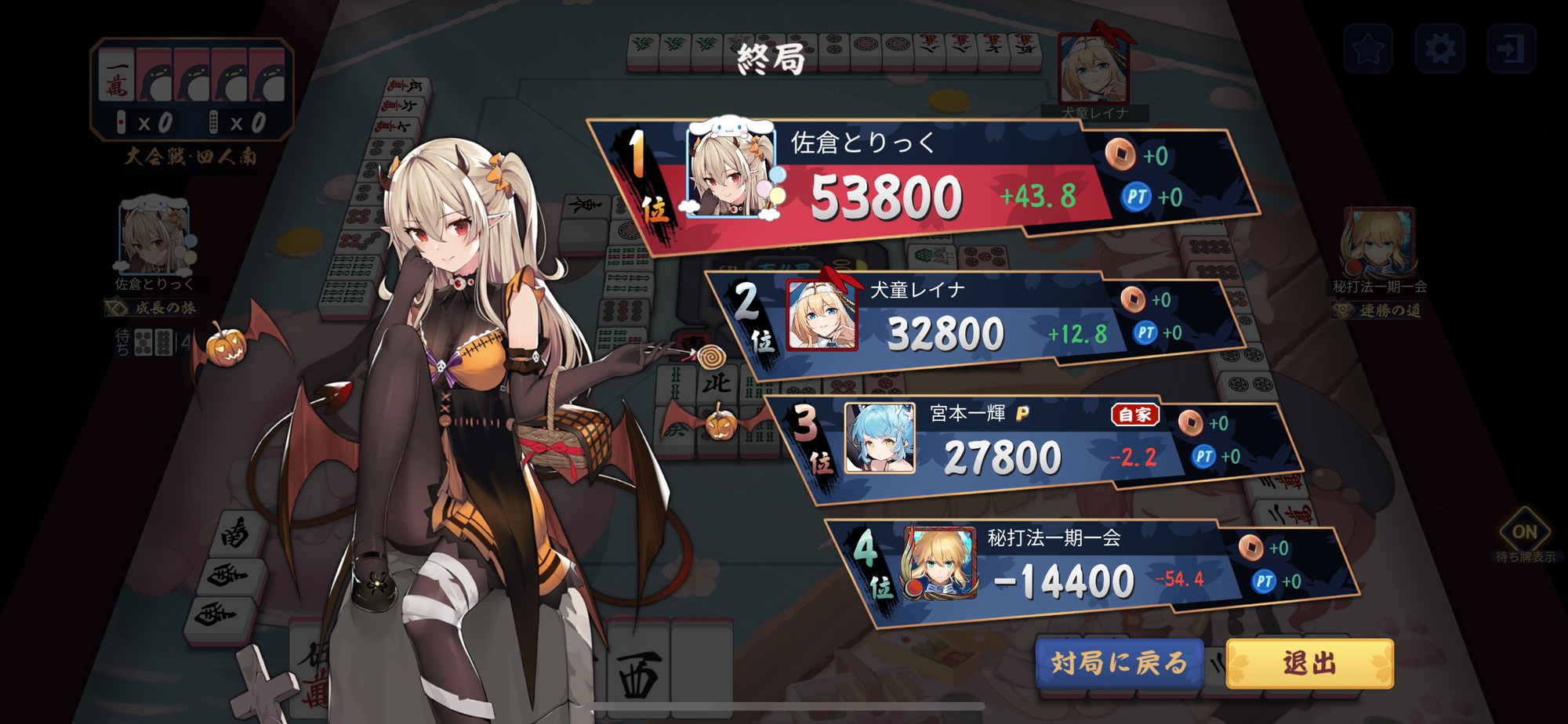 オーラスは佐倉あやねる選手が一期一会選手から1000を出アガリ自力でトップを確定させ、一期一会選手は痛恨の箱下14400と厳しい結果となった。
