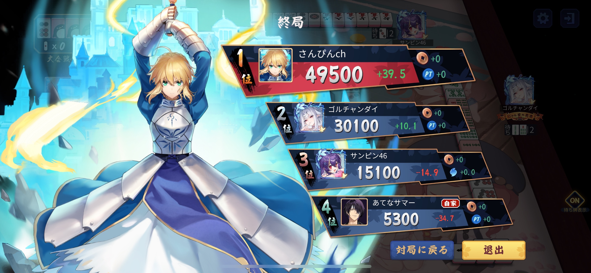 並びは起家からあてな選手(はなまる)・ゴルチャンダイ選手(White Devils)・サンピン選手(Green Lancers)・さんぴん選手(Lelien)。