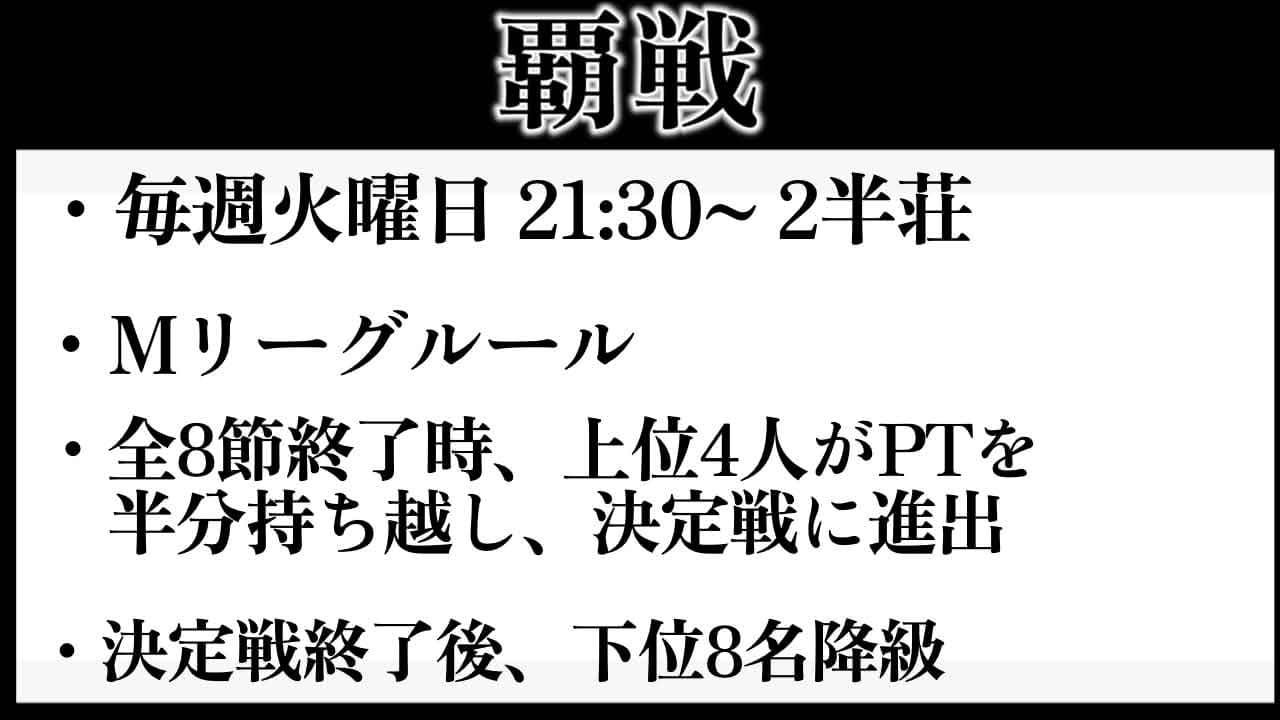覇戦は麻雀プロと配信活動をしている者のみが参加可能な個人戦のリーグ。