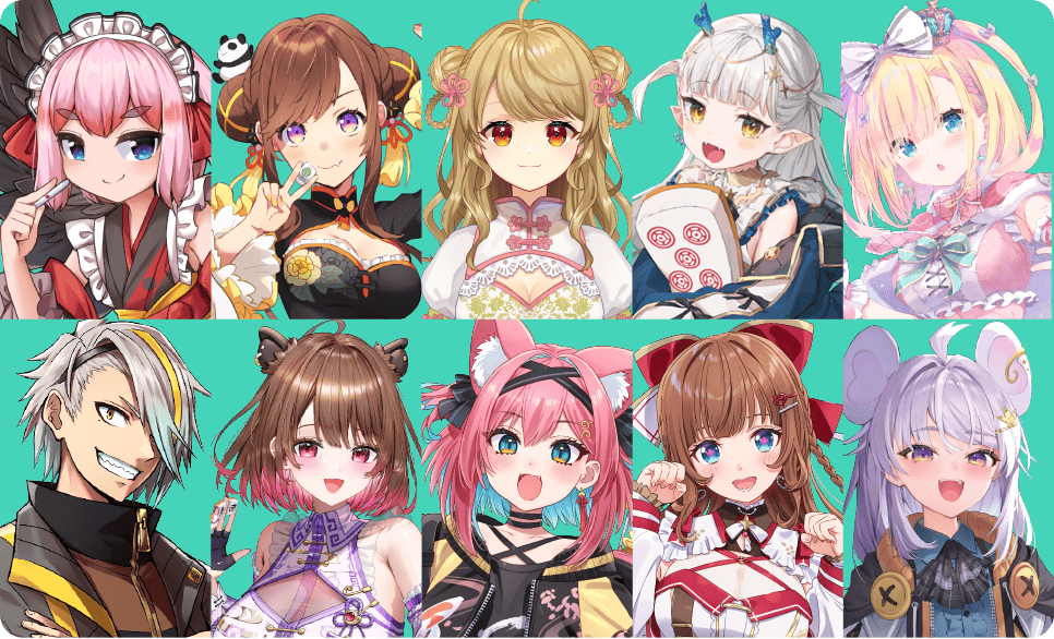 千羽黒乃、咲乃もこ、朝陽にいな、龍惺ろたん、天籠りのん、歌衣メイカ、柚原いづみ、猫撫こぜに、花京院ちえり、まるげりちゃ