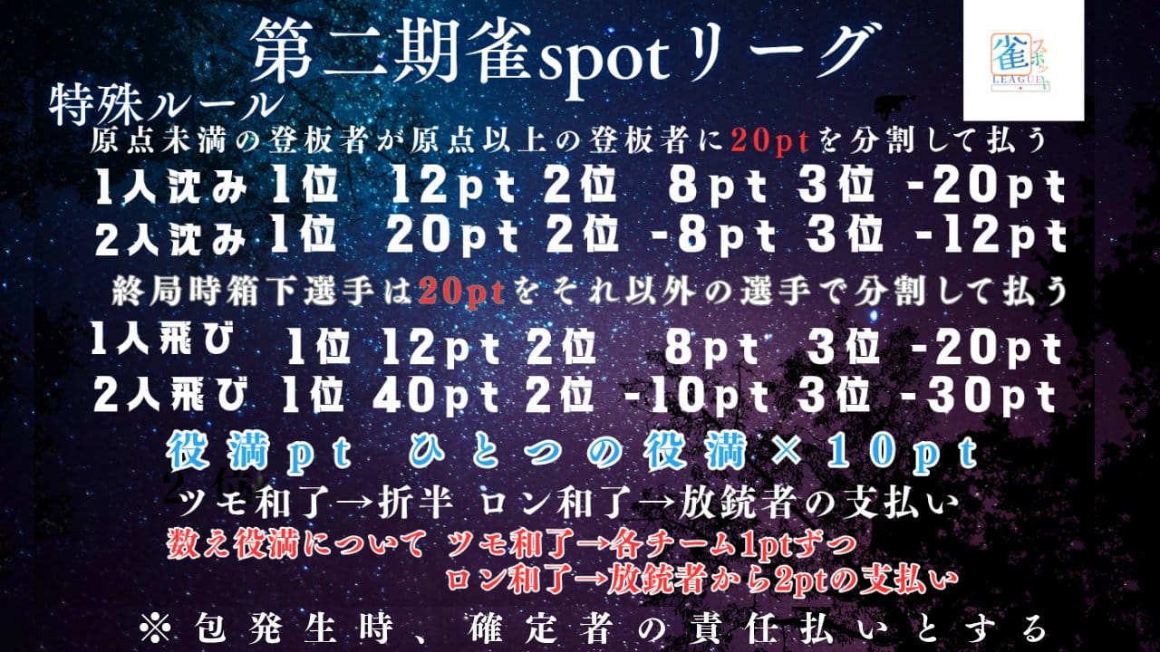 雀spotリーグは、リーグ独自の特殊ルールを加えた三麻のリーグで、浮き沈みや箱下時のポイント配分が変わるなど素点意識が高く必要なルールが採用されている。
