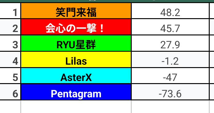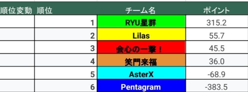 2月1日(日)の開幕戦では、笑門来福と会心の一撃!が少し抜き出て、Pentagramが苦しいスタート。