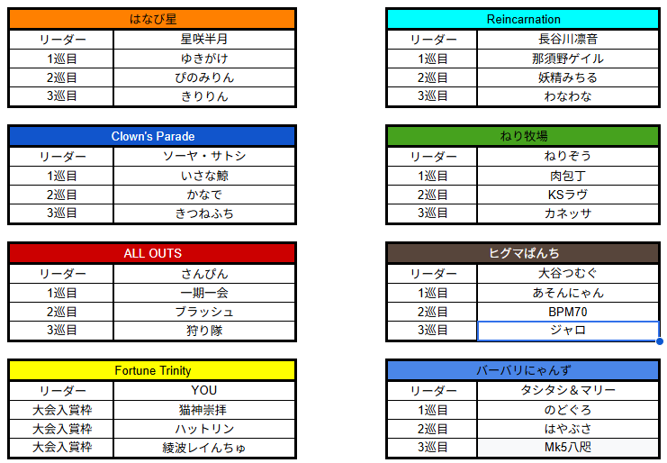 開幕戦となる第1節は2月13日(金)に行われ、バーバリにゃんずが一歩抜け出し、Clown's Parade・Reincarnationが続く形に。