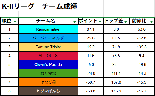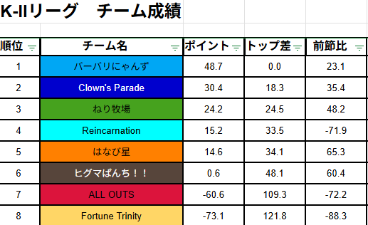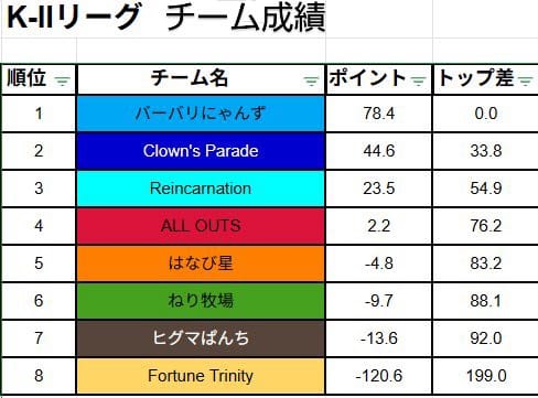 2位だったバーバリにゃんずは、プラスは大きくないもののしっかり積み重ねて首位に復帰。