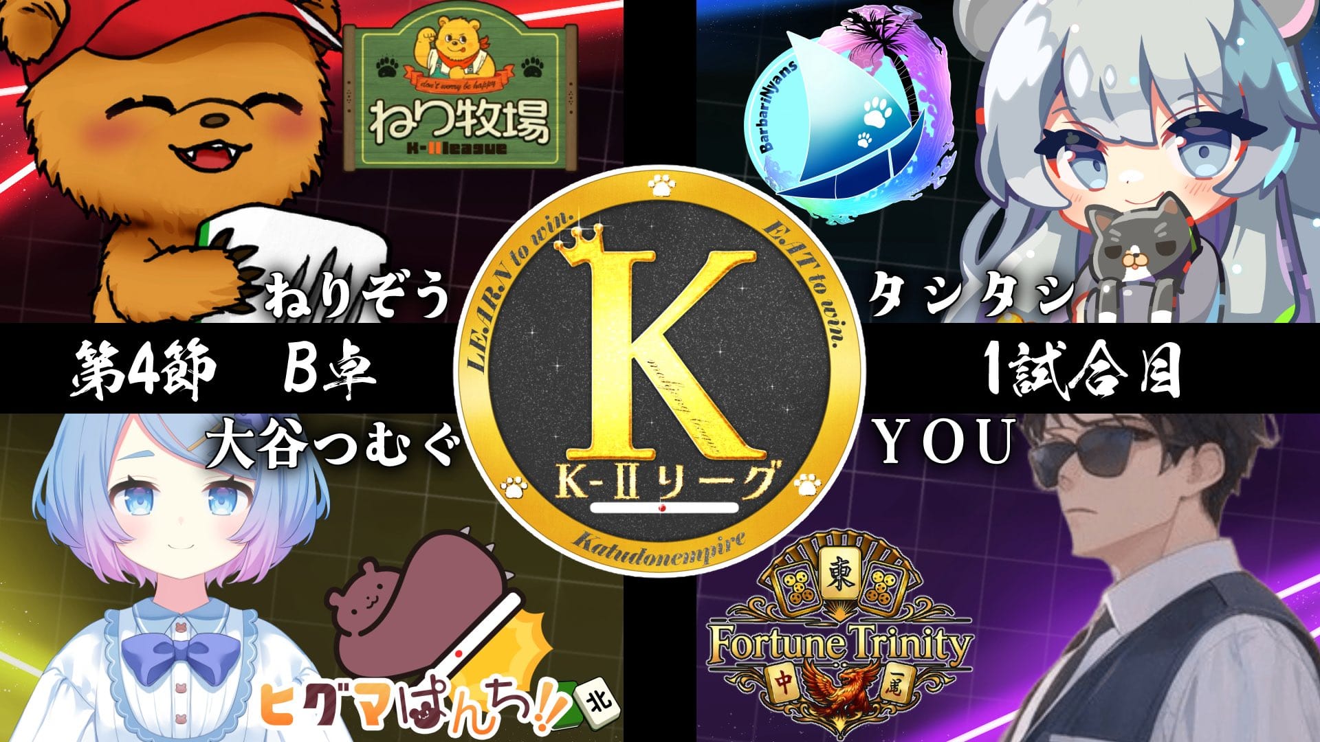 並びは起家からねりぞう選手(ねり牧場)・大谷つむぐ選手(ヒグマぱんち!!)・タシタシ選手(バーバリにゃんず)・YOU選手(Fortune Trinity)。