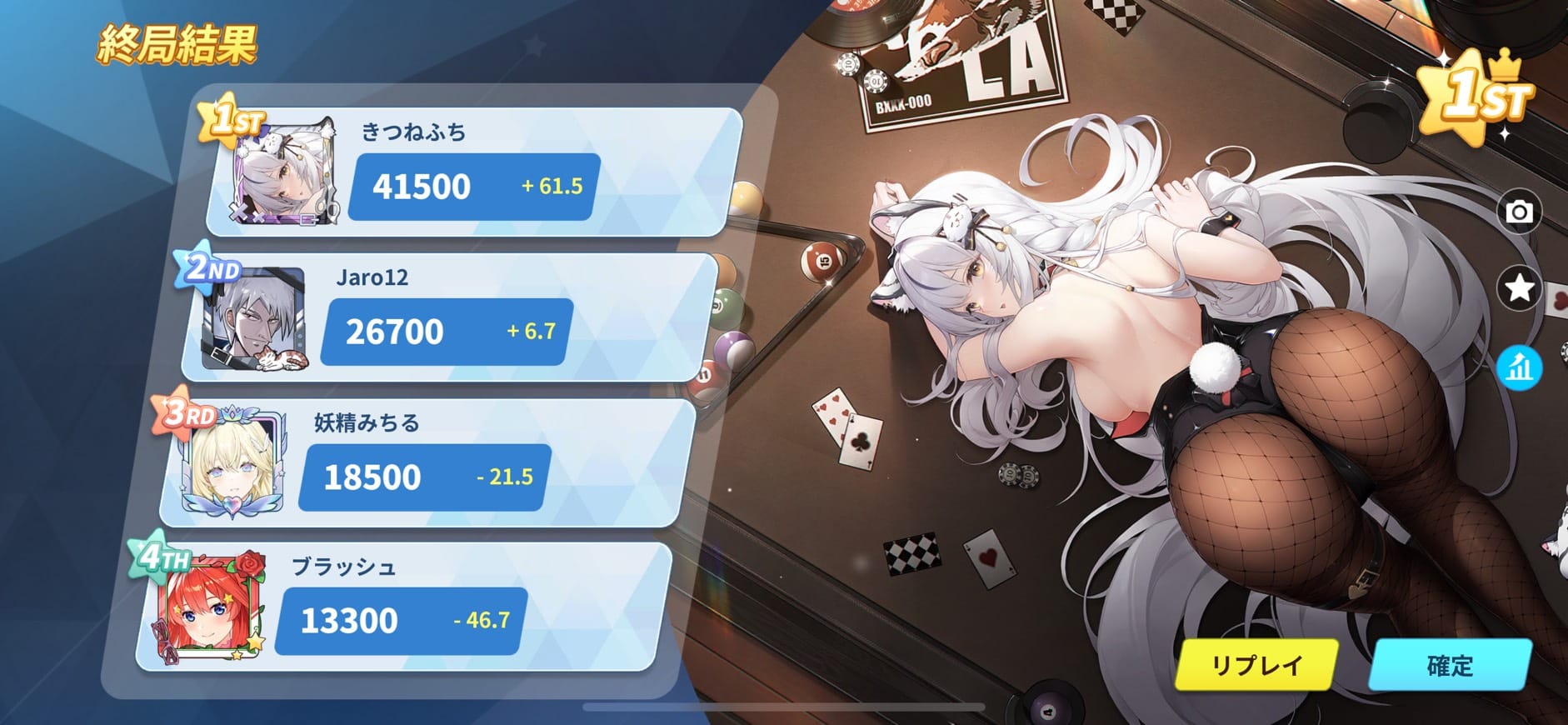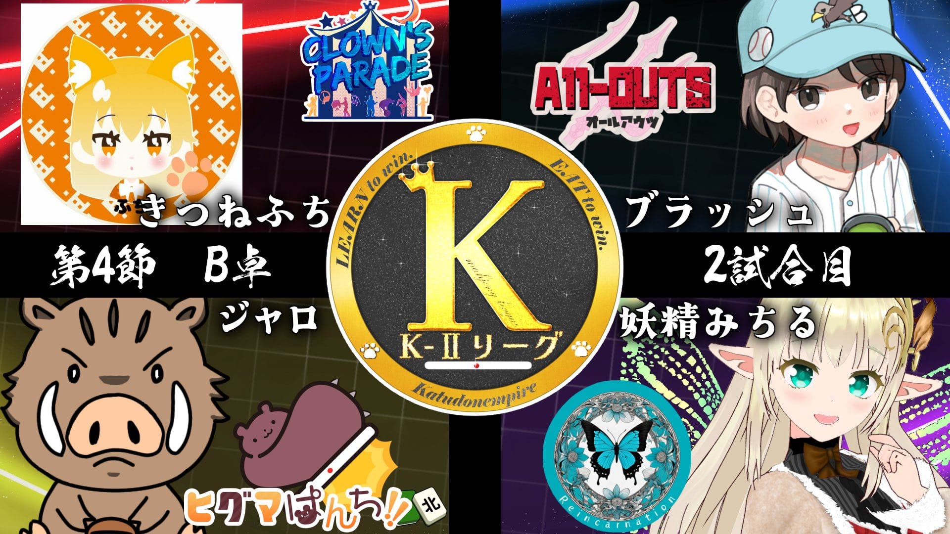 並びは起家からジャロ選手(ヒグマぱんち!!)・きつねふち選手(Clown's Parade)・ブラッシュ選手(ALL-OUTS)・妖精みちる選手(Reincarnation)。