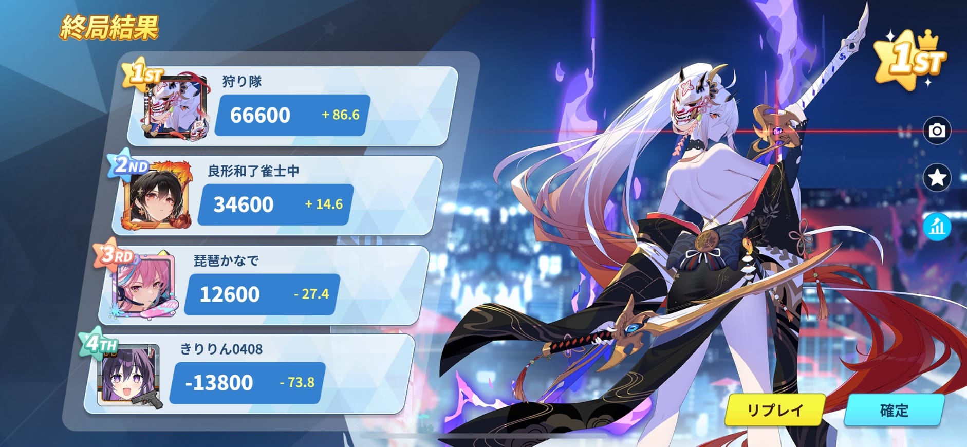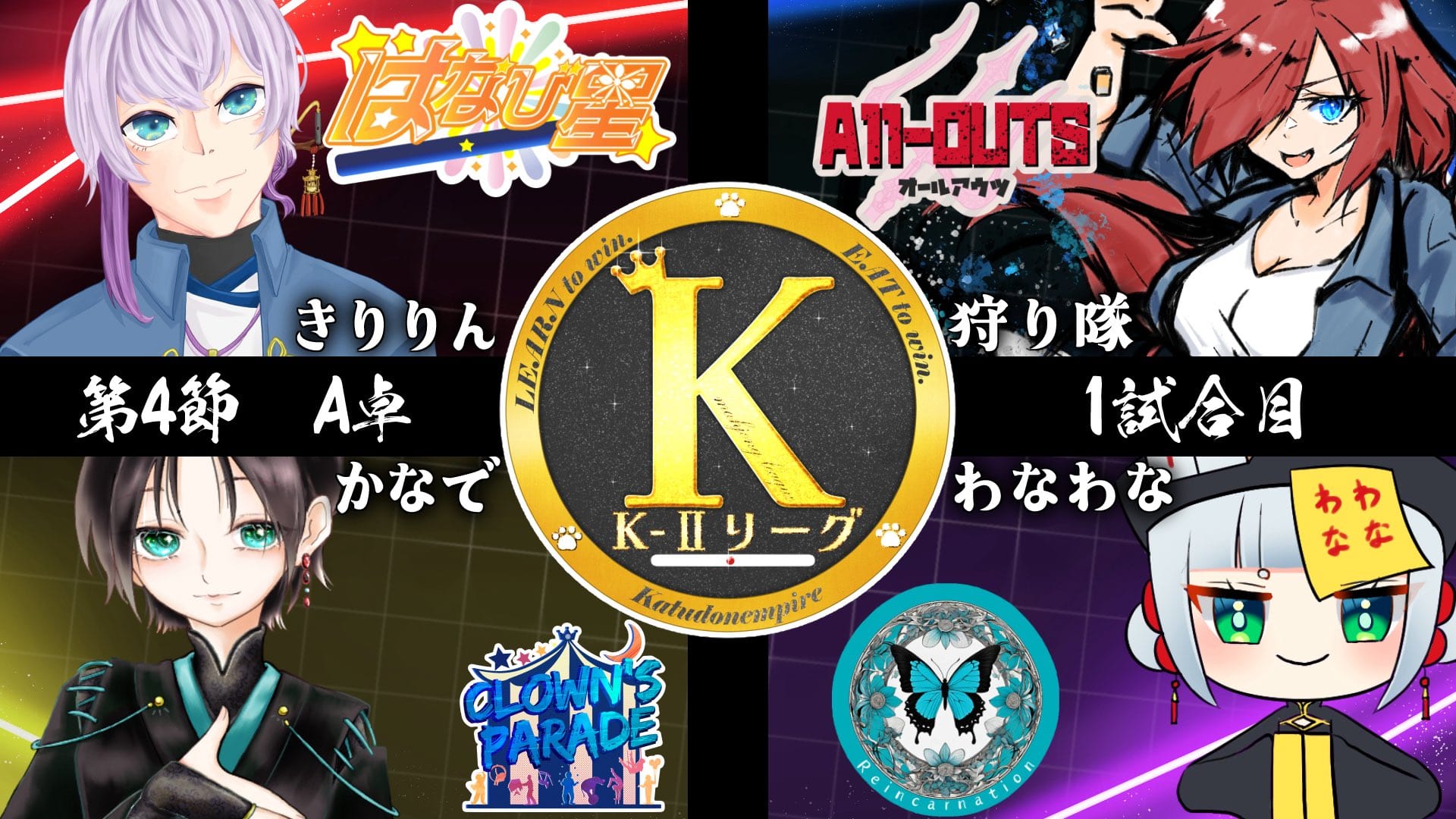 並びは起家から狩り隊選手(ALL-OUTS)・かなで選手(Clown's Parade)・わなわな選手(Reincarnation)・きりりん選手(はなび星)。