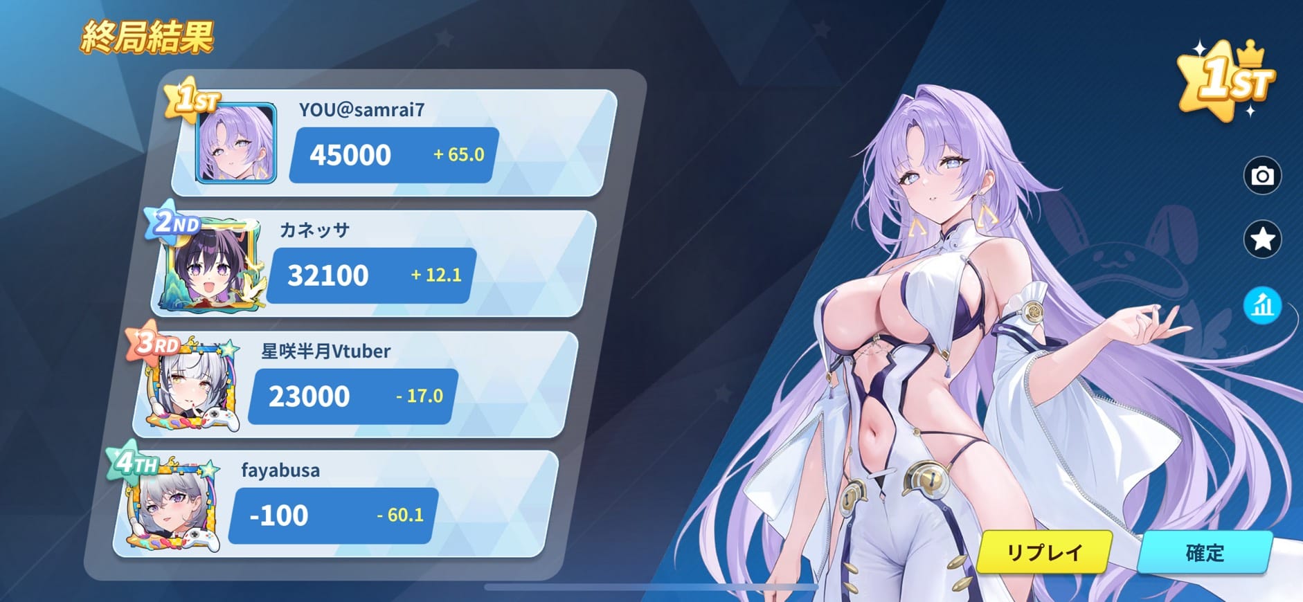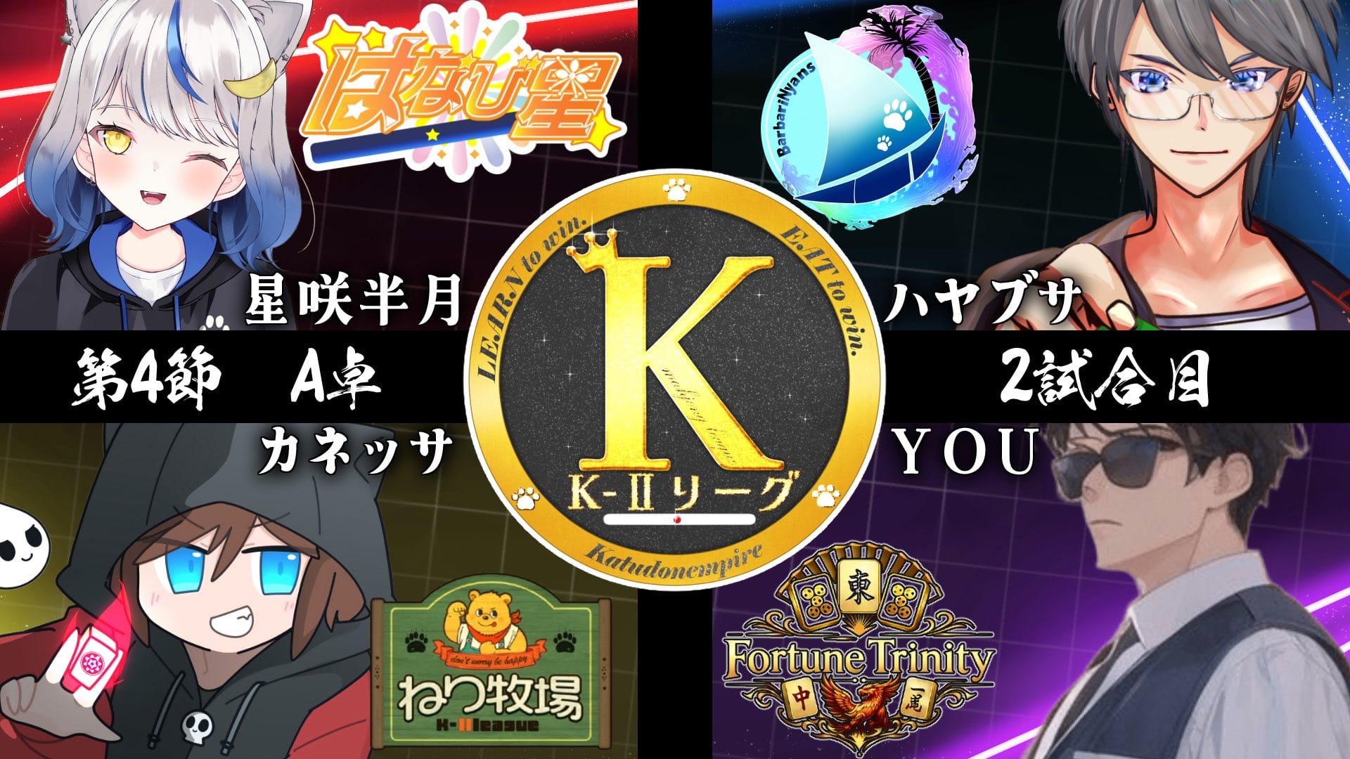 並びは起家からカネッサ選手(ねり牧場)・星咲半月選手(はなび星)・ハヤブサ選手(バーバリにゃんず)・YOU選手(Fortune Trinity)。