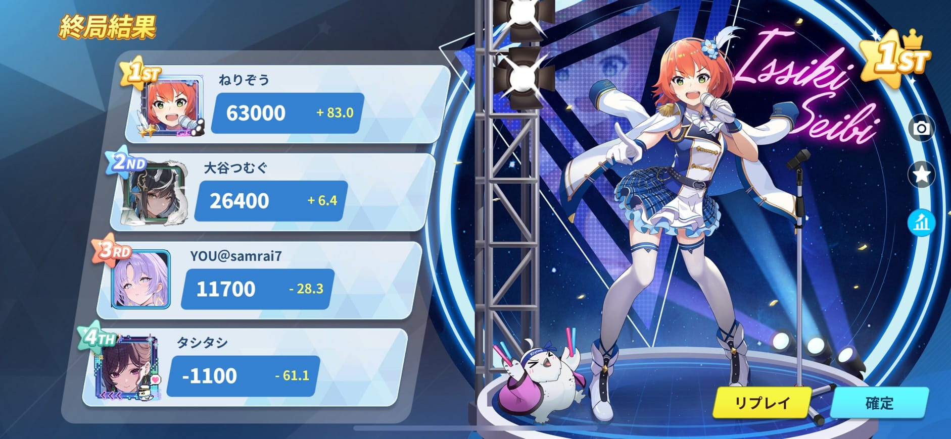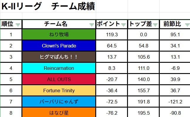 下位のチームもプラスでポイントを戻し始めたが、バーバリにゃんず・はなび星が一気に下位に沈む結果となった。
