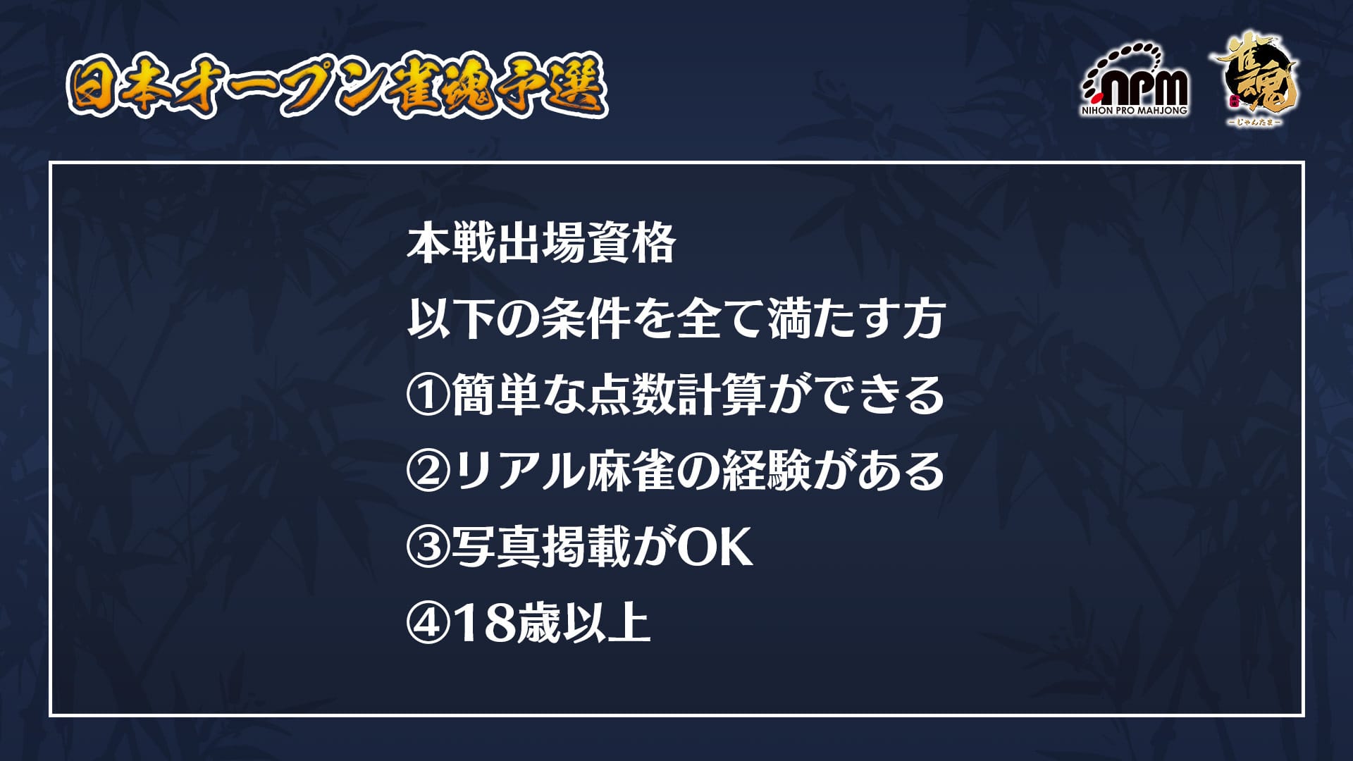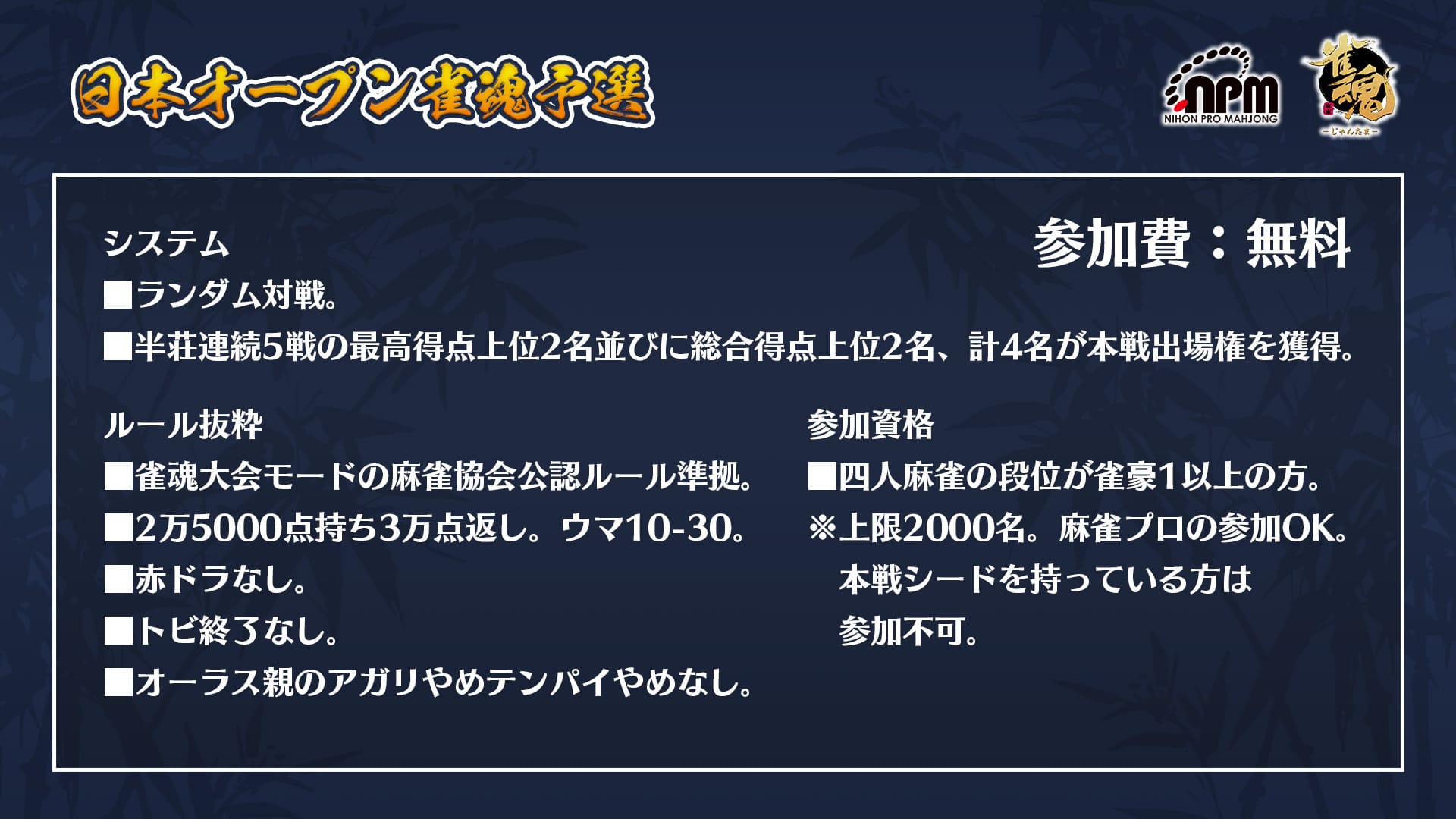 参加資格は四人麻雀の段位が雀豪1以上で、本選シードを持っている方以外であれば誰でも参加が可能。