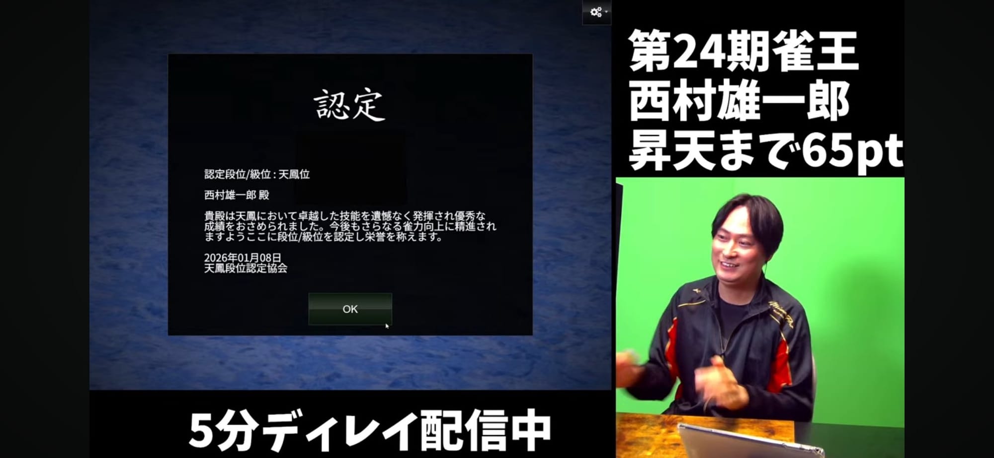 1月8日(木)、YouTube「日本プロ麻雀協会」チャンネルにて、4日に第24期雀王を獲得したばかりの西村雄一郎選手による、ネット麻雀「天鳳」における天鳳位への昇天戦配信が行われた。