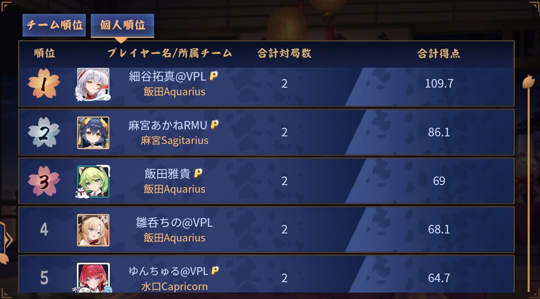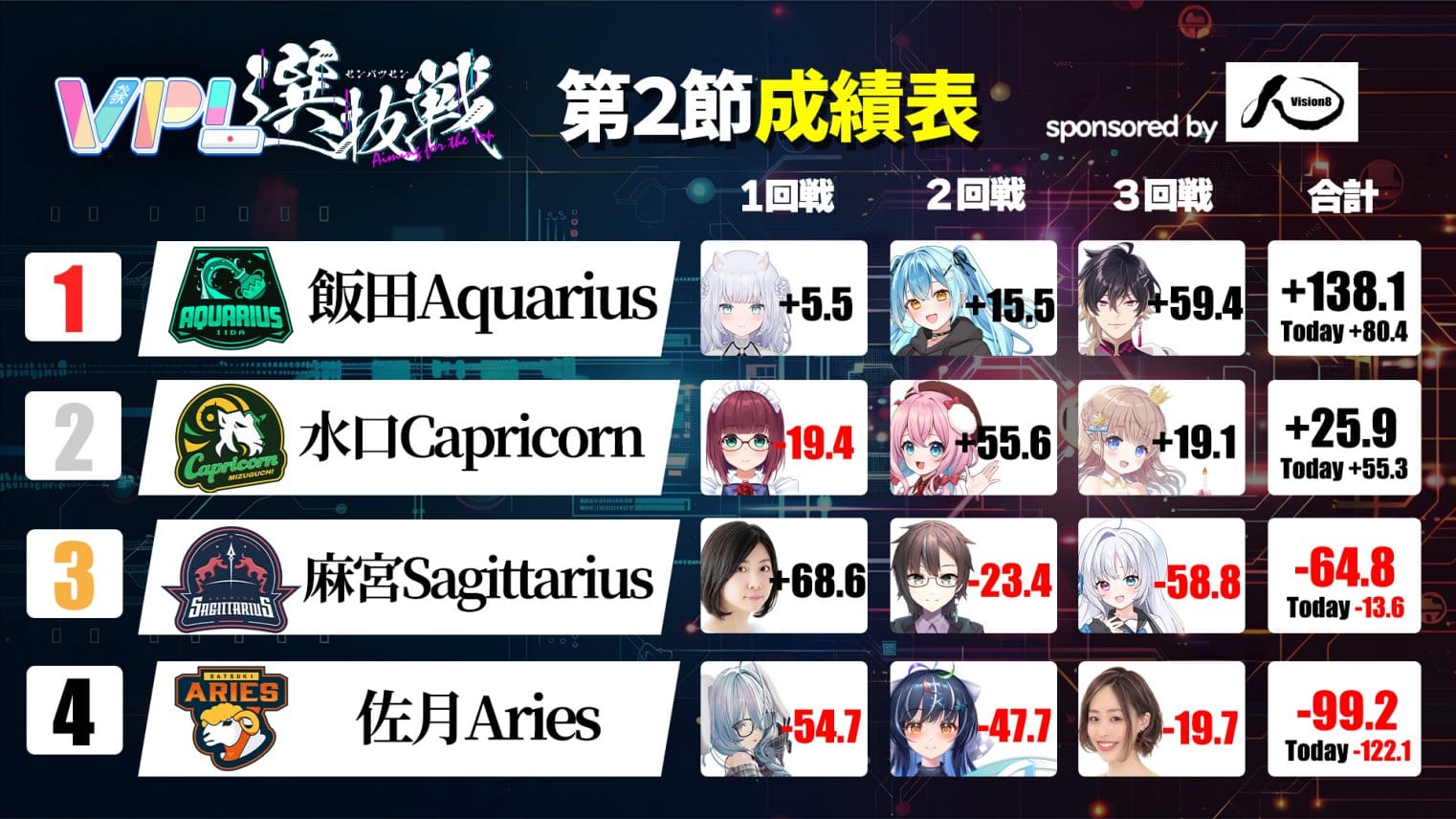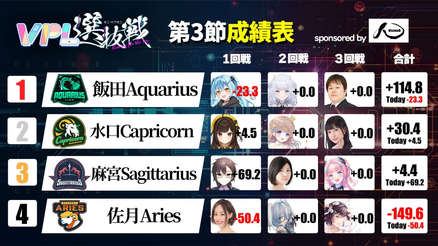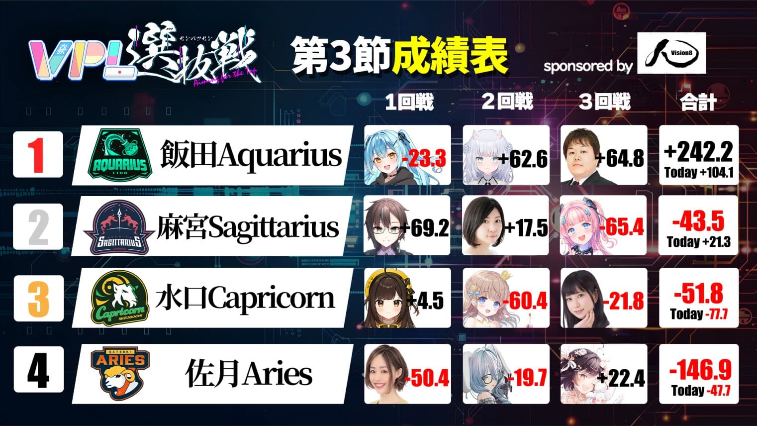 最下位は佐月Ariesだが、最後に劇的なアガリを見せ、次節に勢いを繋げられるか注目したいところ。