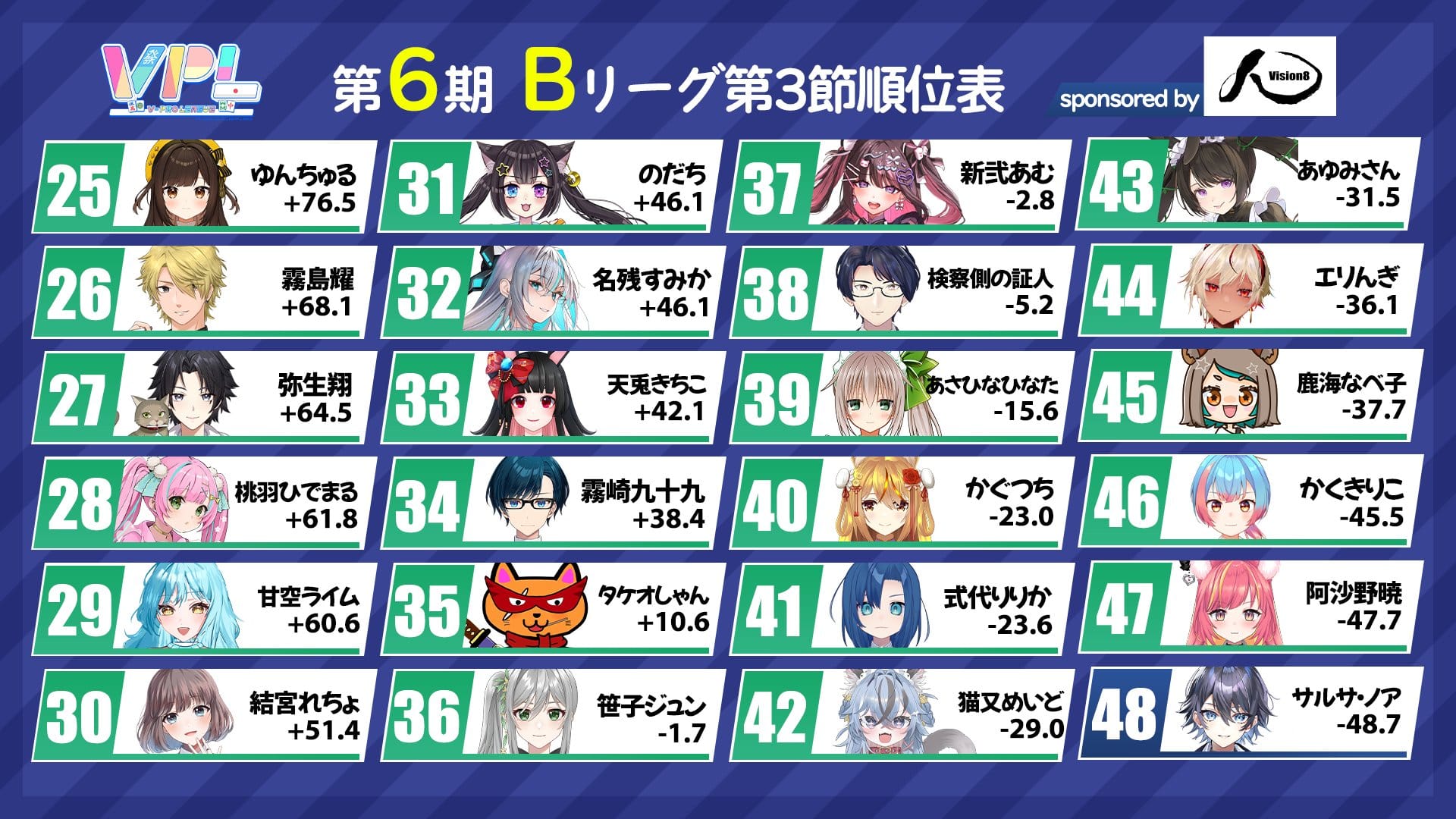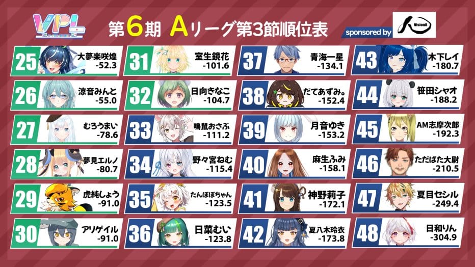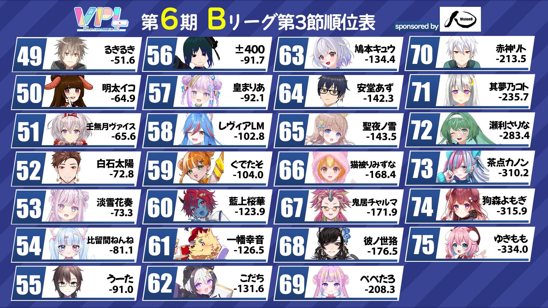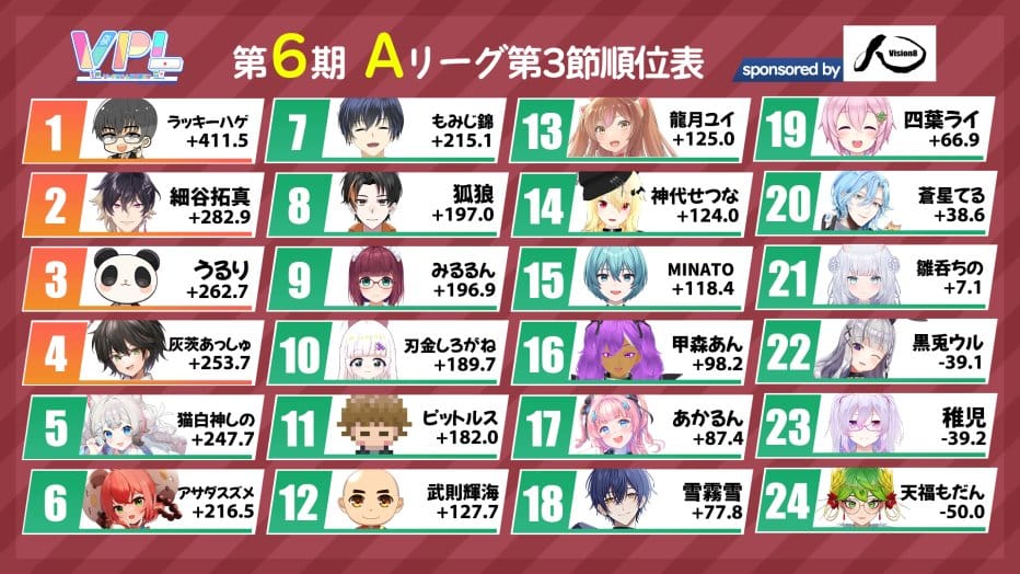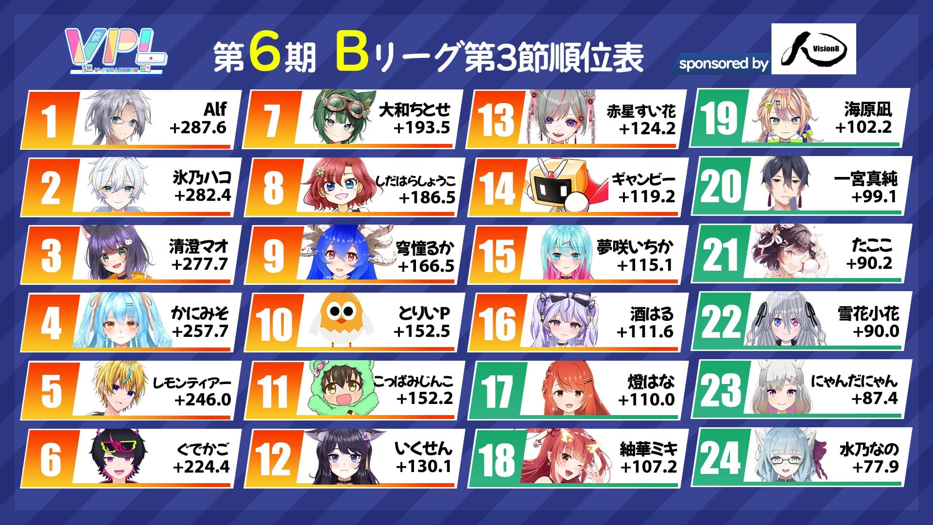 5位には第1期フレッシュスターのレモンティアー選手、9位には弊誌の紙面の方でVPLページの記事を書いていただいている穹憧るか選手が入り、Aリーグ返り咲きを狙っている。
