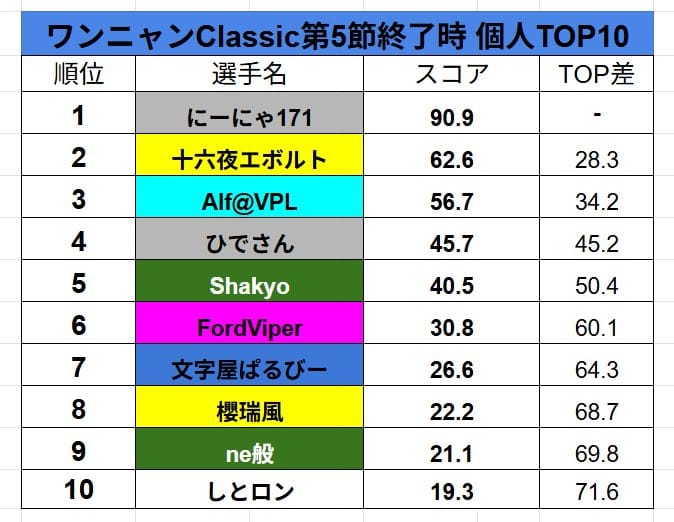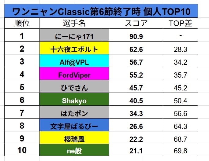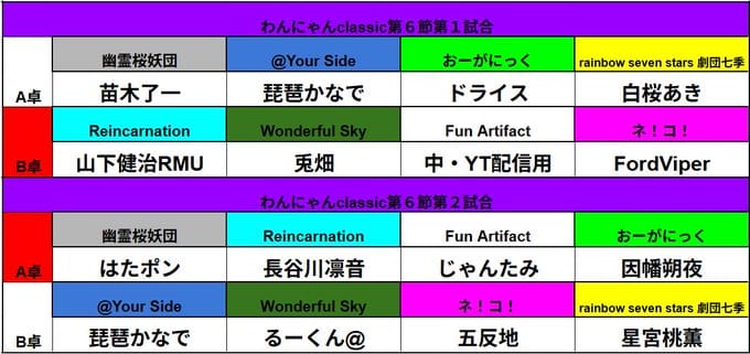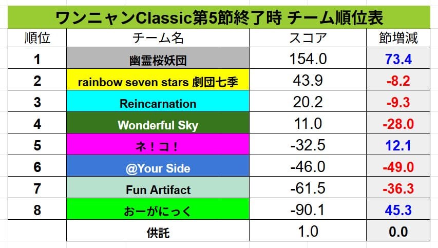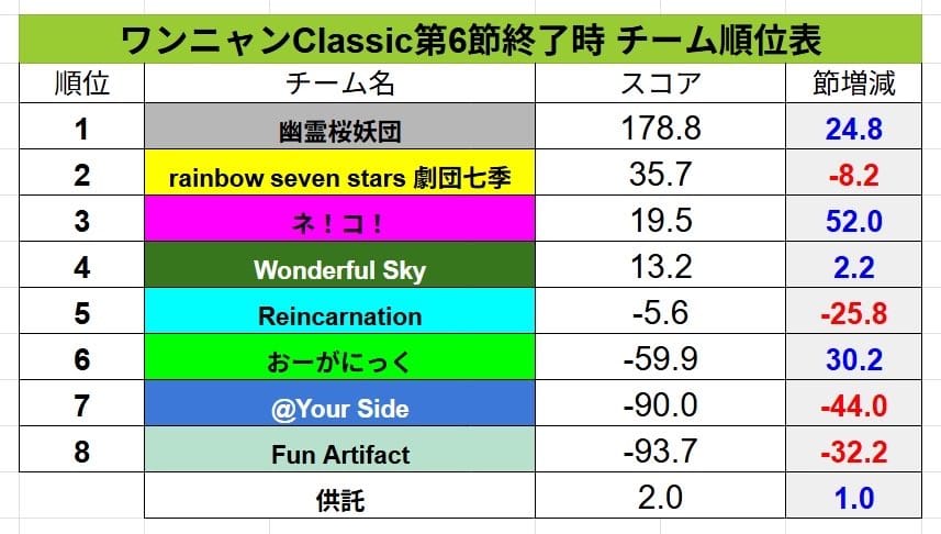 【ワンニャンClassic】第6節は幽霊桜妖団が引き続きリードし、ネ!コ!がついにプラス圏へ‼