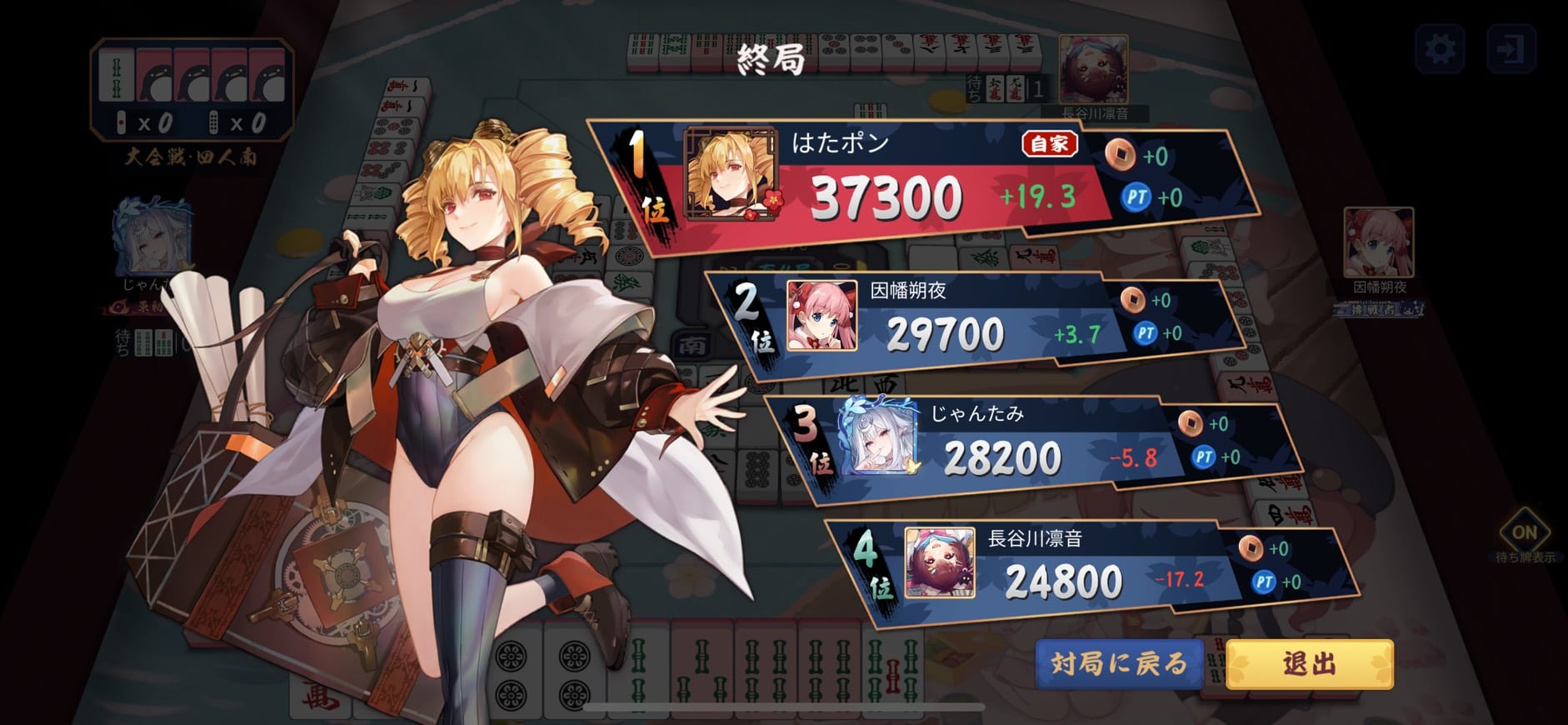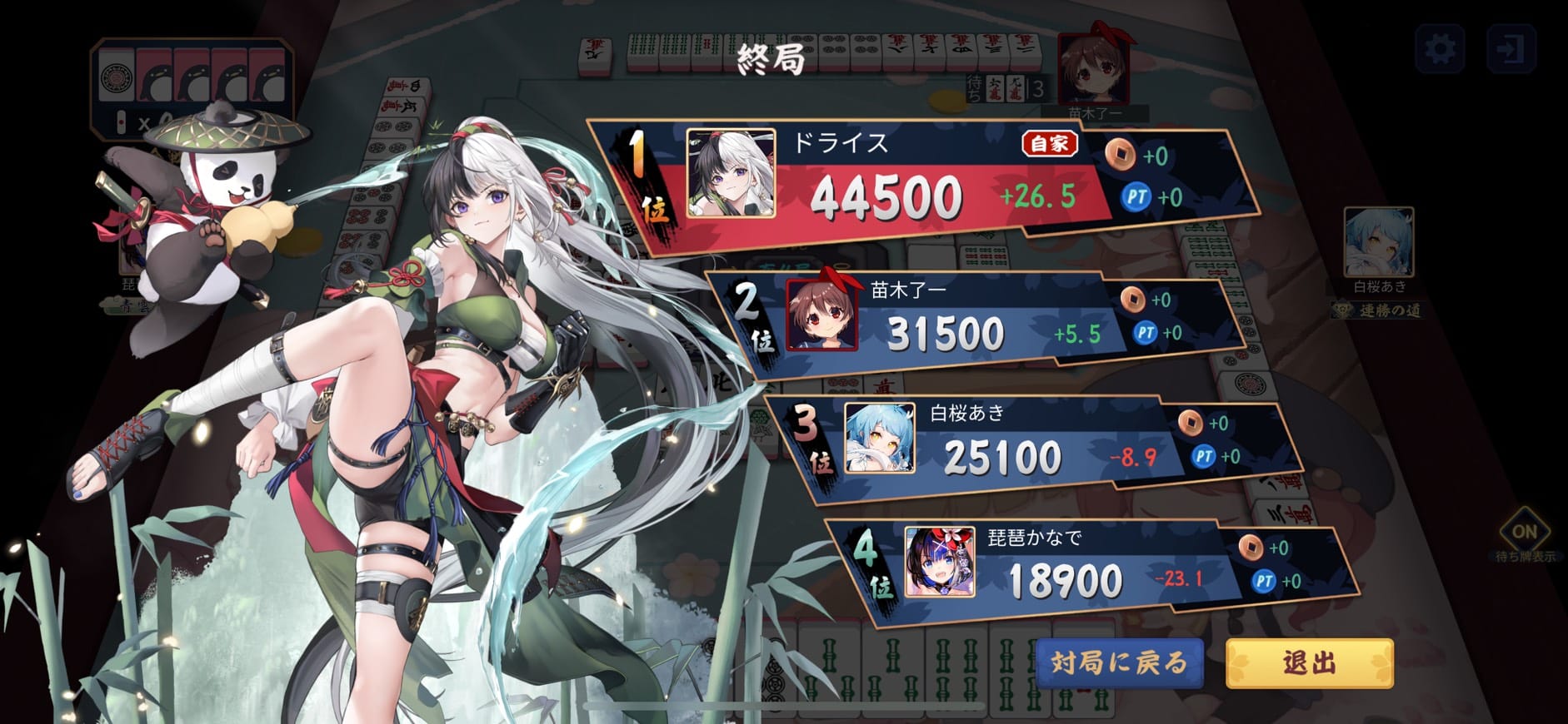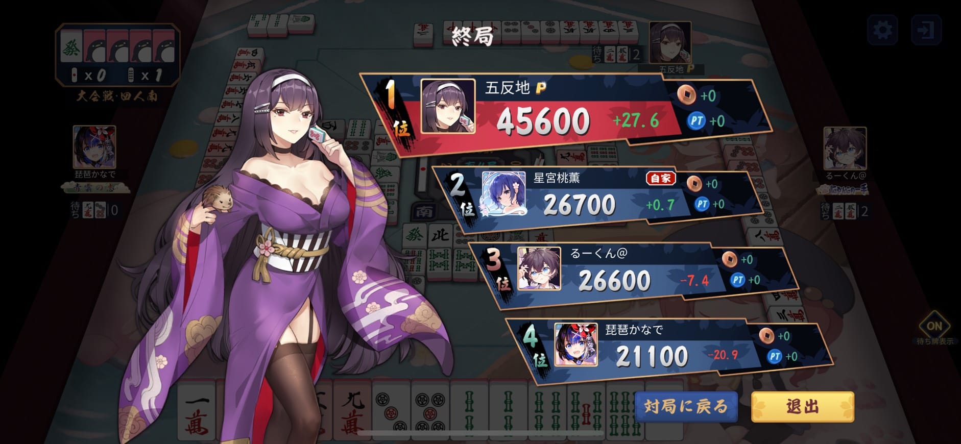 小さいが3度のアガリを決めた苗木良一選手が2着、白桜あき選手・琵琶かなで選手はアガリが無く苦しい対局となった。