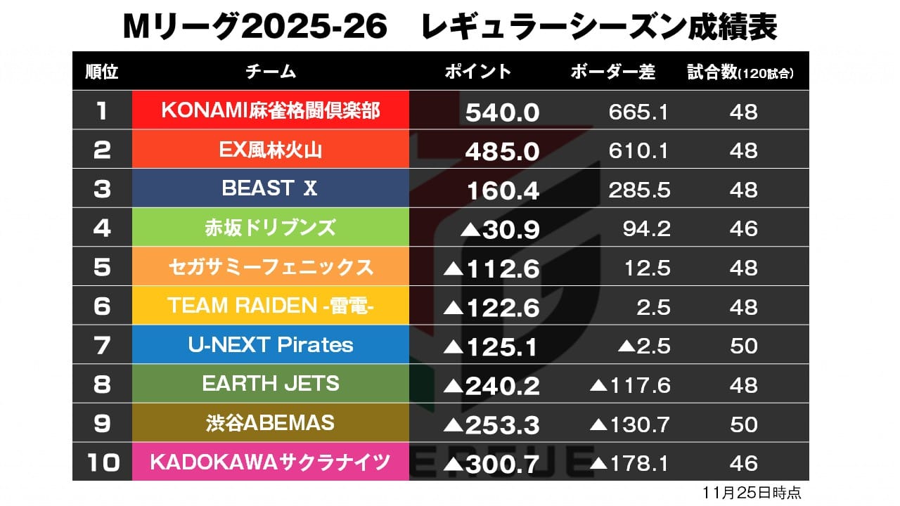 11月25日(火)のMリーグは、サクラナイツ・雷電・ABEMAS・フェニックスが対戦した。