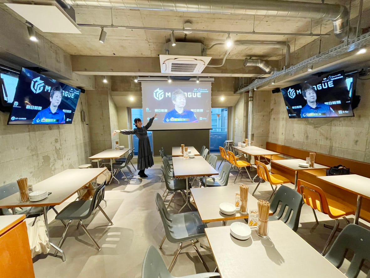 どの席に座ってもMリーグの熱戦がプロジェクターや大型モニターで楽しめるよう設計されています。