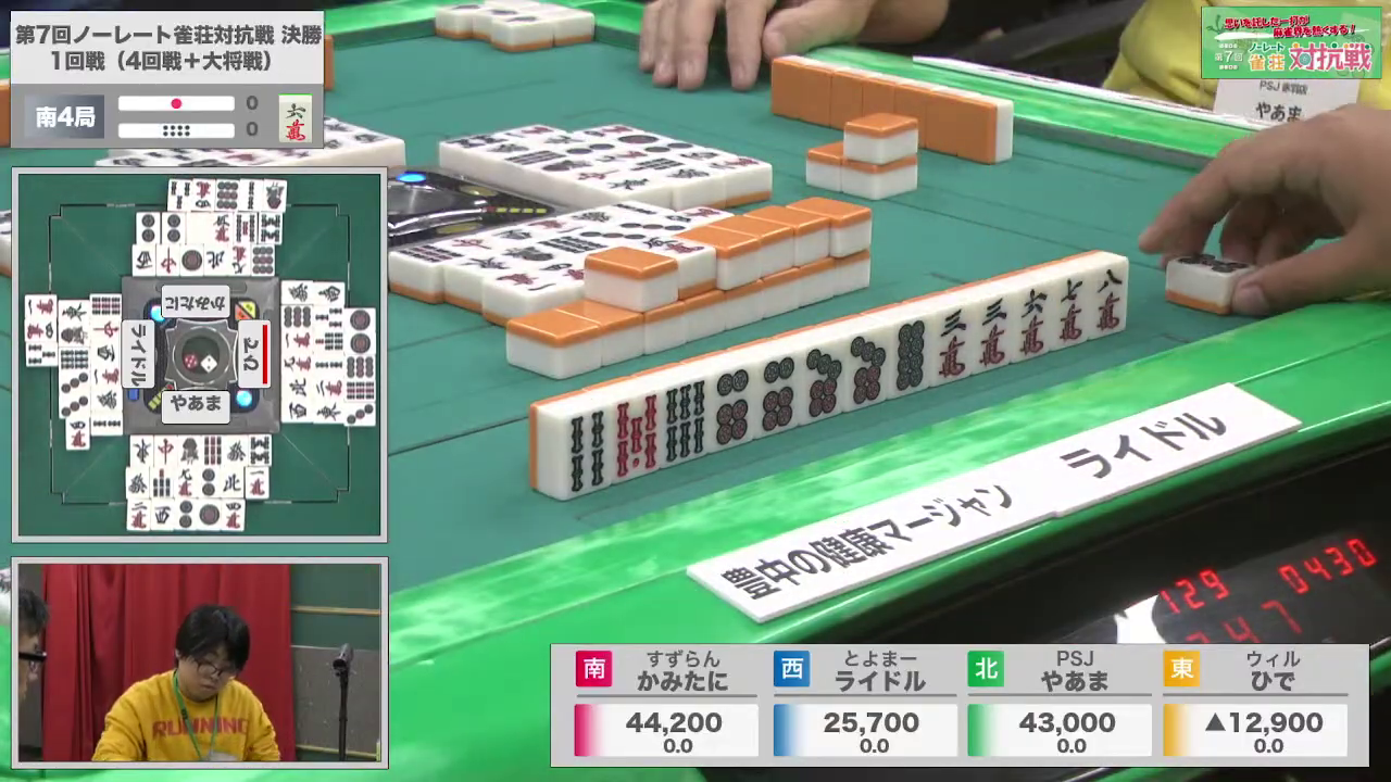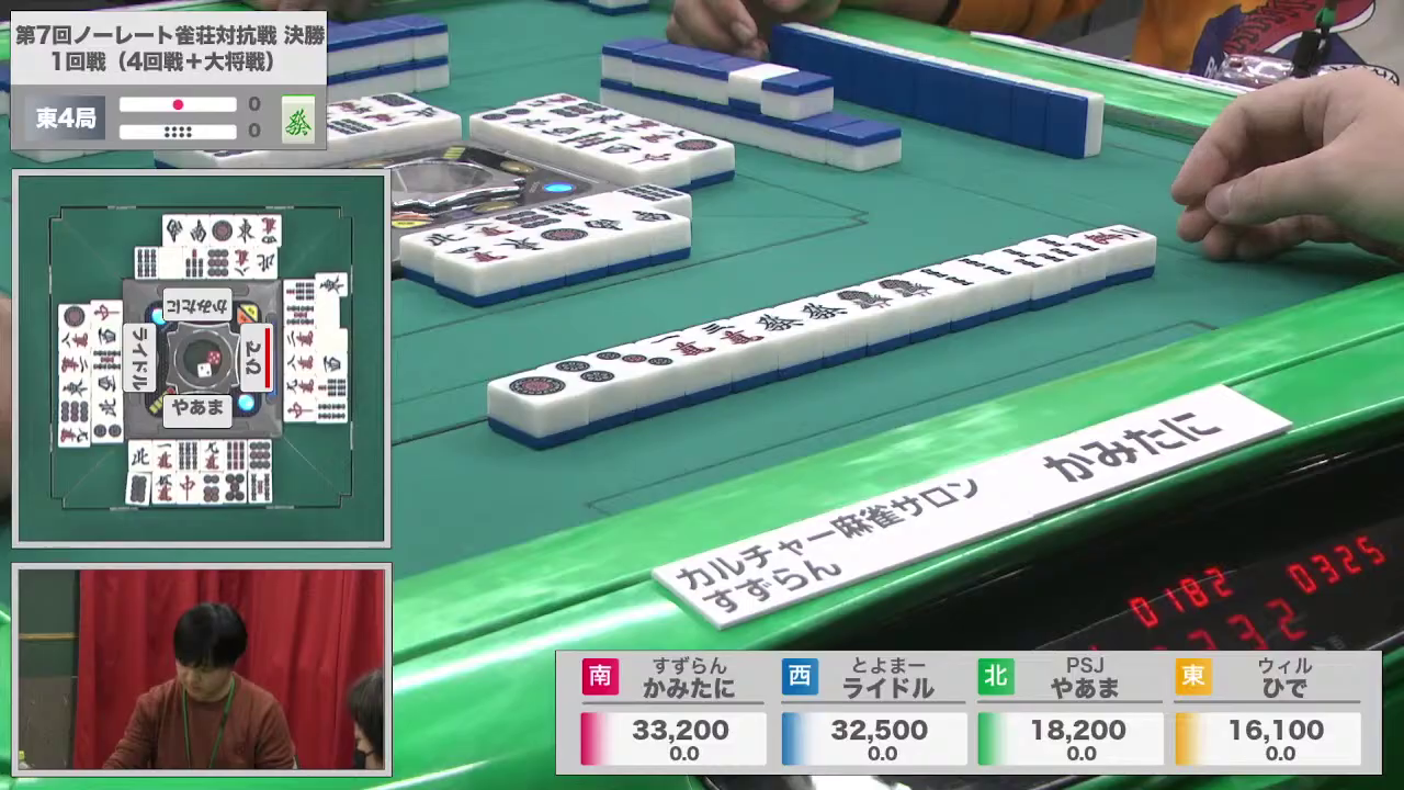 1回戦の配信卓には、起家からカルチャー麻雀サロンすずらんからかみたに選手、豊中の健康マージャンからライドル選手、PSJ赤羽店からやあま選手、麻雀サロンウィルからひで選手が登場。