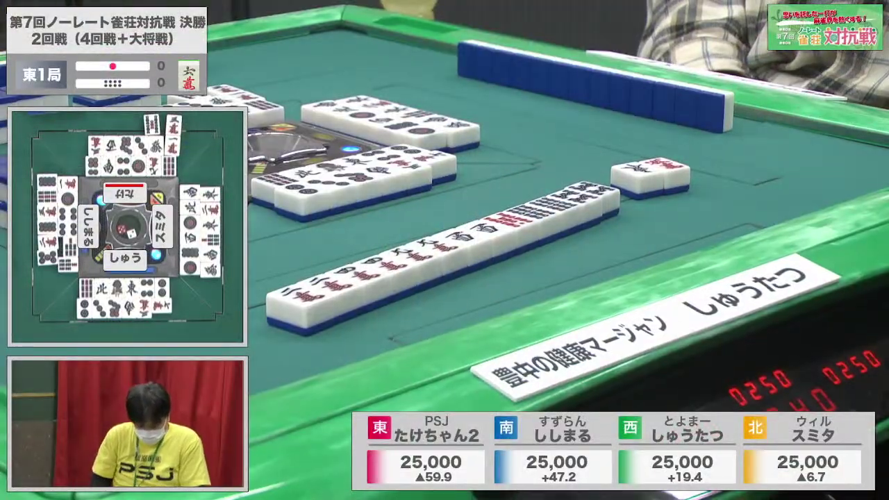 2回戦の配信卓には、起家からPSJ赤羽店からたけちゃん2選手、カルチャー麻雀サロンすずらんからししまる選手、豊中の健康マージャンからしゅうたつ選手、麻雀サロンウィルからスミタ選手が登場。