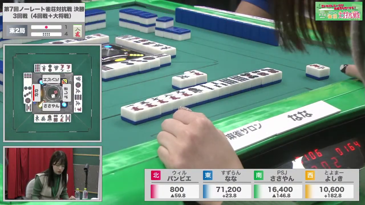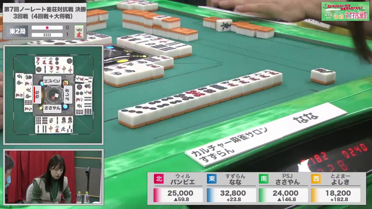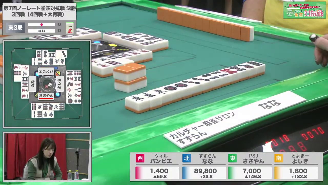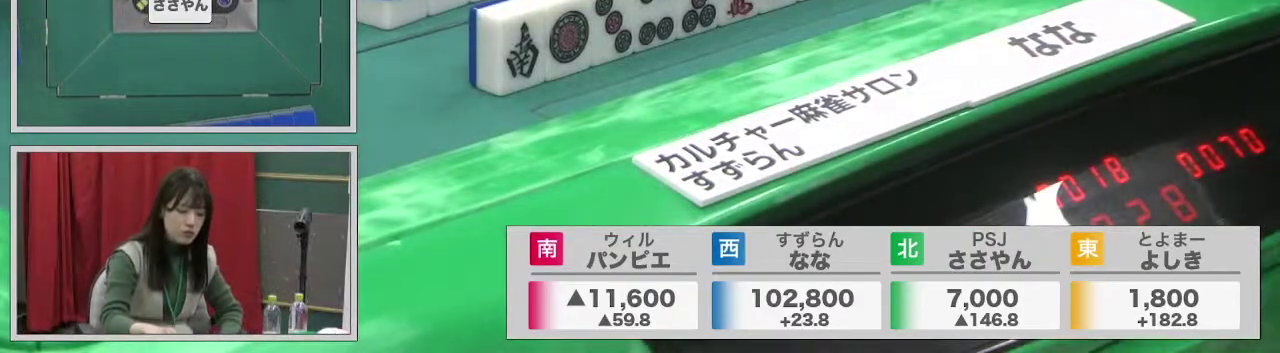 その後はささやん選手・よしき選手の熾烈な2着争いが繰り広げられる中、最終局はなな選手が3着目だったPSJ・ささやん選手に5800点を放銃しゲームセット。