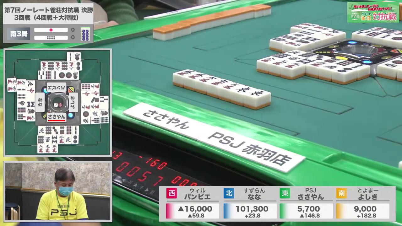 3回戦の配信卓には、起家から麻雀サロンウィル・パンピエ選手、カルチャー麻雀サロンすずらん・なな選手、PSJ赤羽店・ささやん選手、豊中の健康マージャン・よしき選手が登場。
