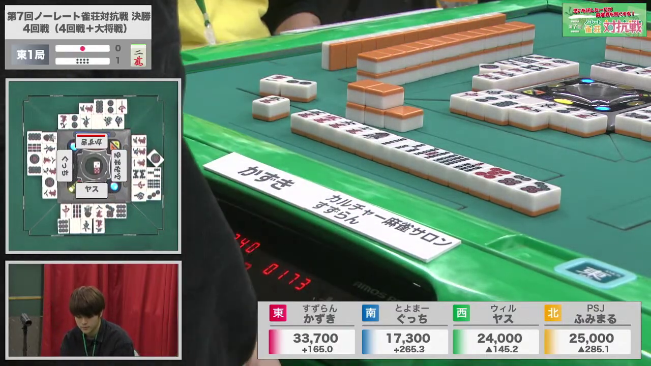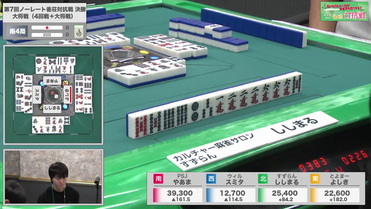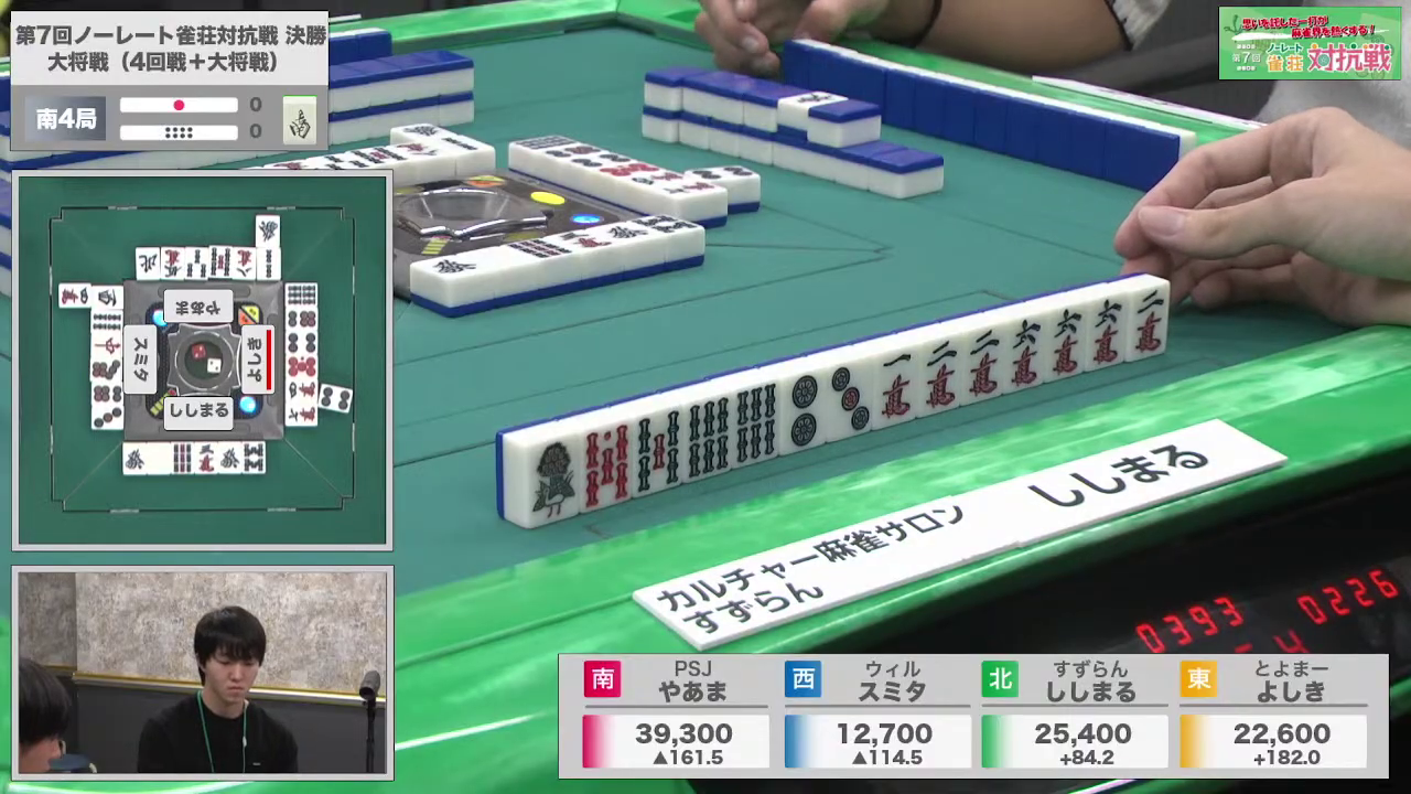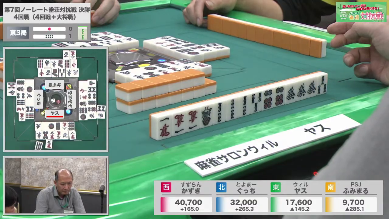 大将戦には、起家からPSJ赤羽店・やあま選手、麻雀サロンウィル・スミタ選手、カルチャー麻雀サロンすずらん・ししまる選手、豊中の健康マージャン・よしき選手が皆が積み上げたチームポイントを背負って登場。