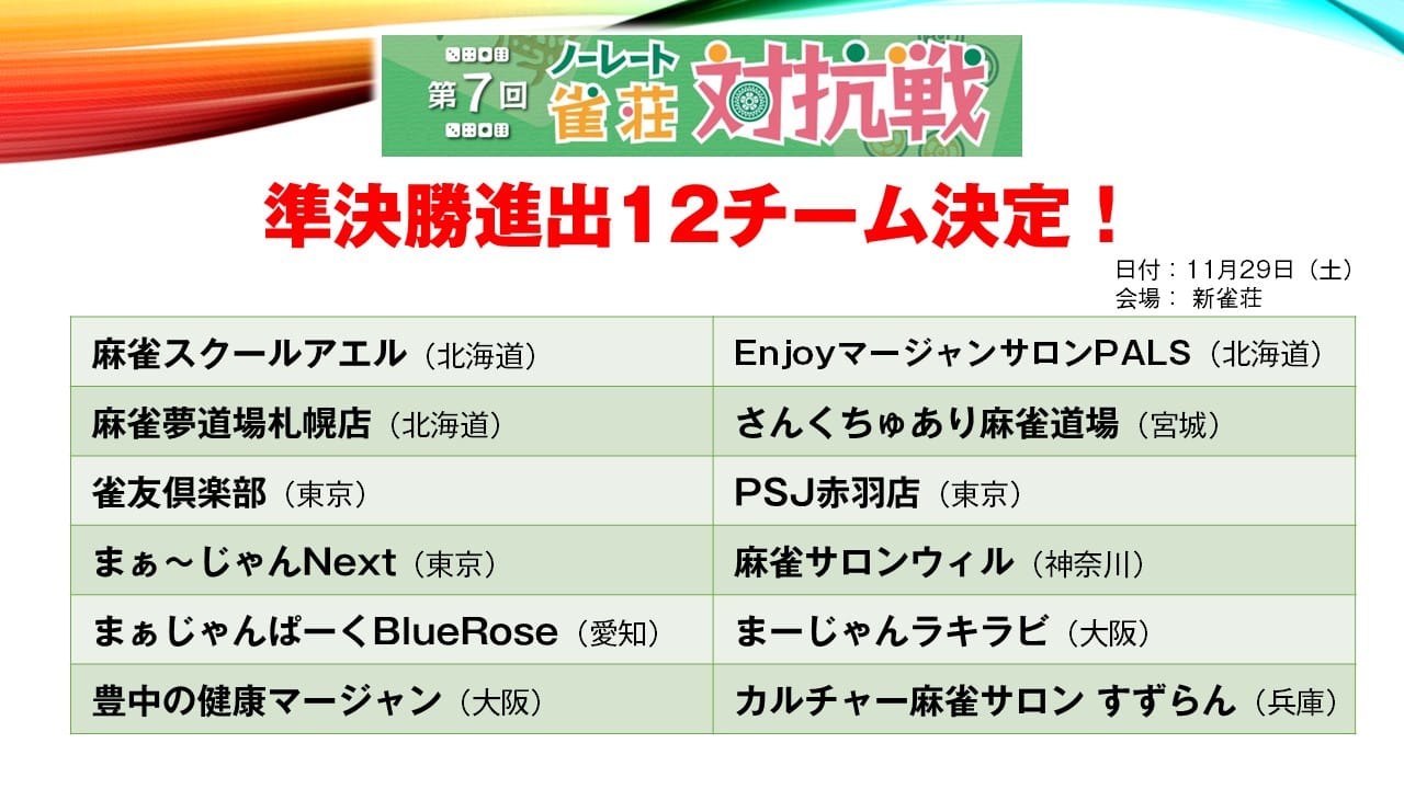 11月29日(土)に月刊麻雀界主催「ノーレート雀荘対抗戦」の準決勝が新橋・「新雀荘」にて開催され、東日本予選①②・西日本予選を勝ち上がった12チームが出場した。