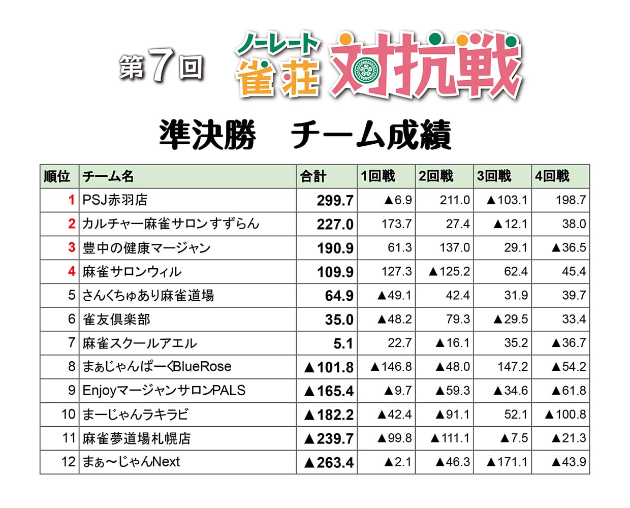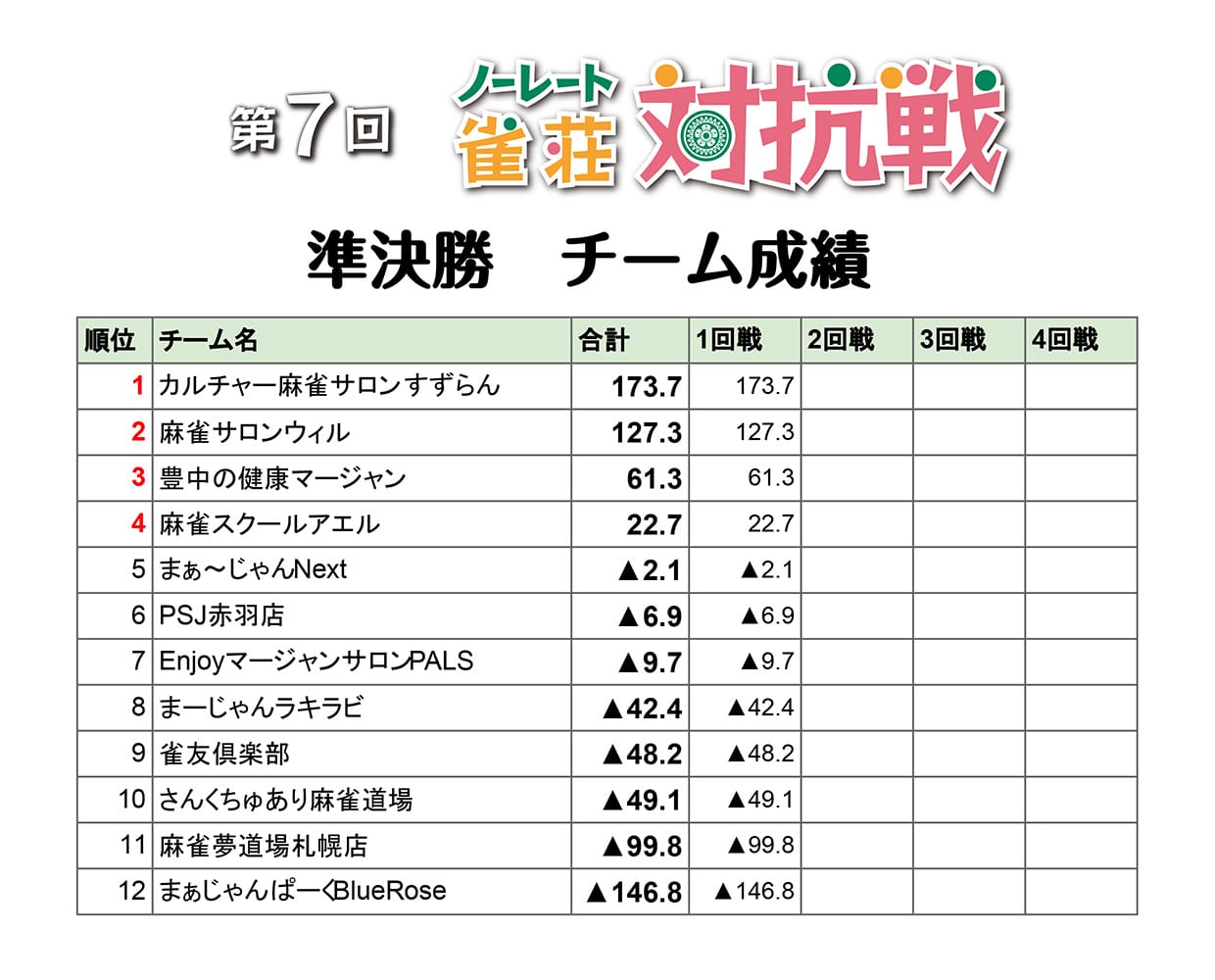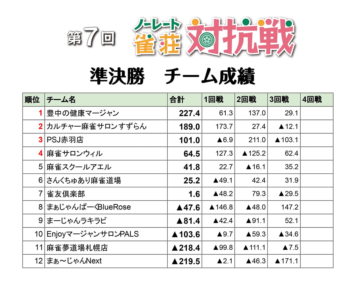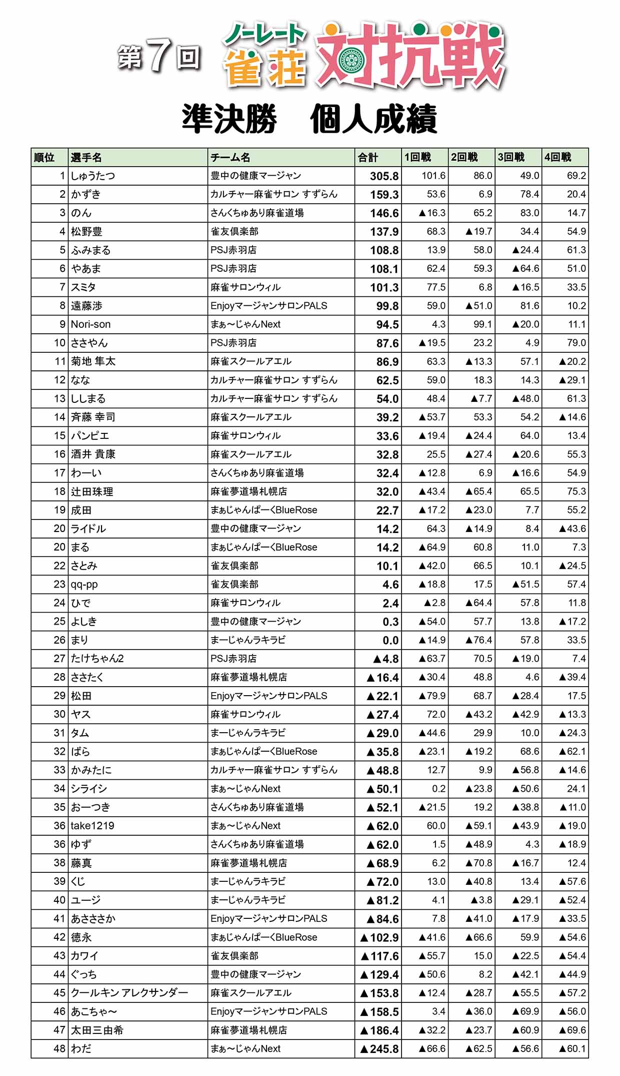 準決勝の個人スコアは以下の通り。MVPは4戦4勝・豊中の健康マージャンチームのしゅうたつ選手となった。