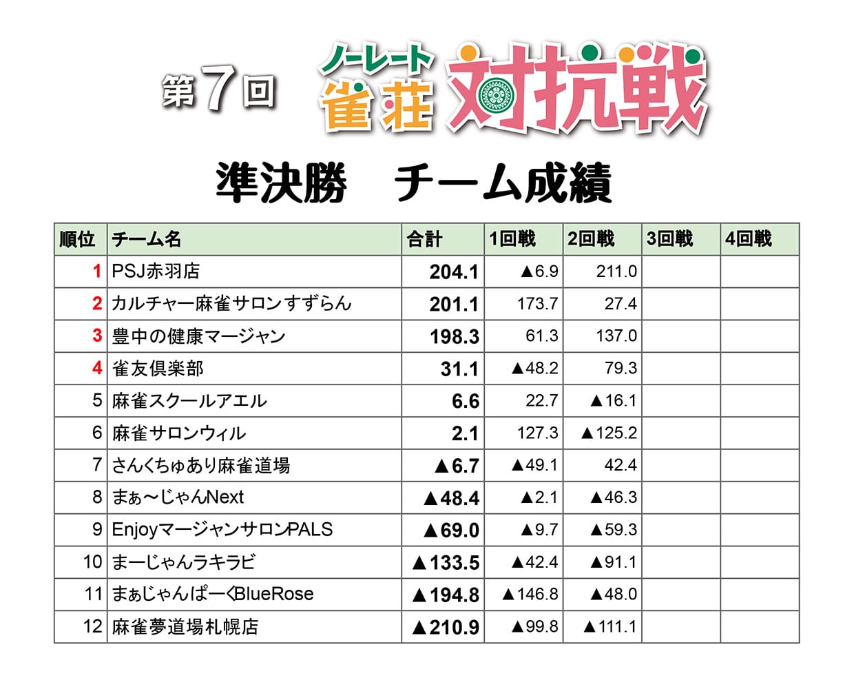 準決勝1位通過の「PSJ赤羽店」チーム、2位通過の「カルチャー麻雀サロンすずらん」チーム