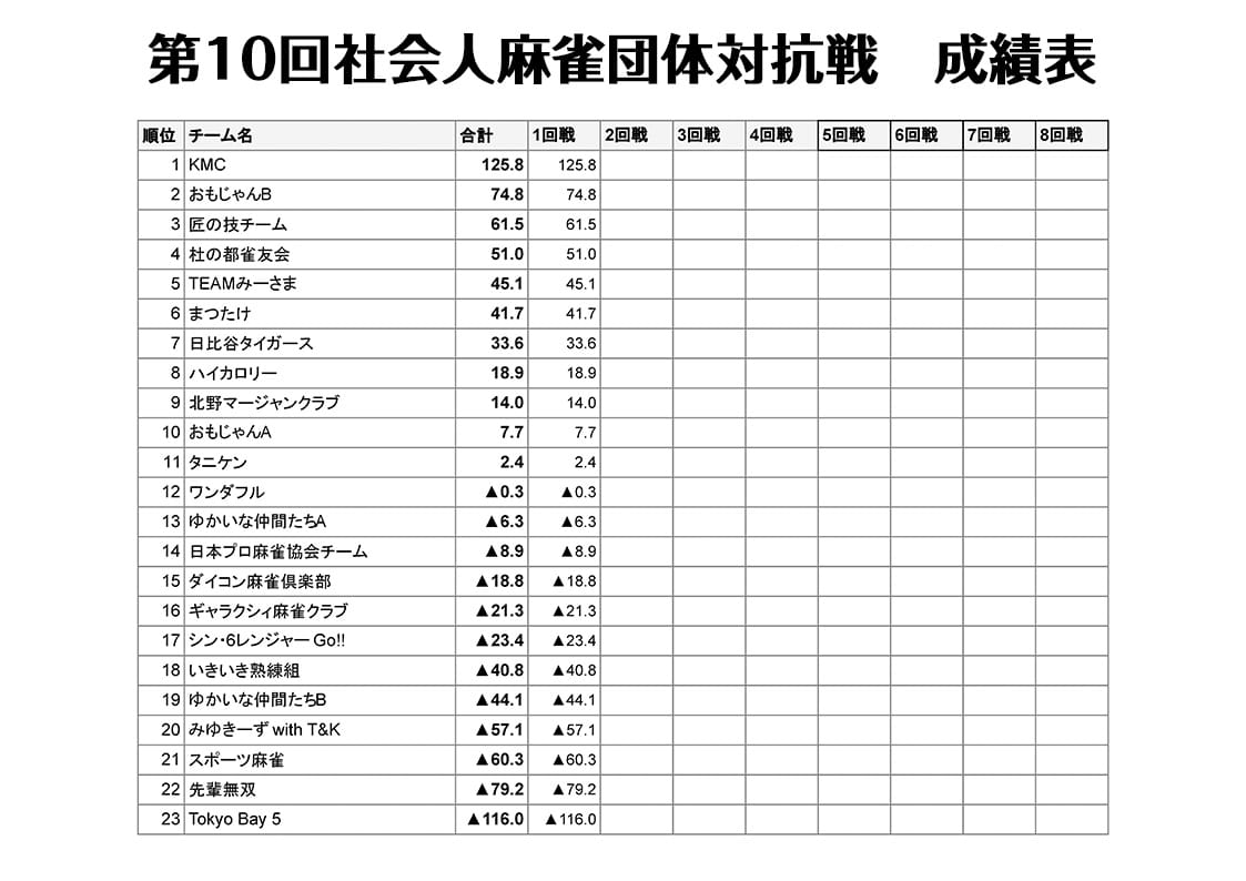 1回戦目は会社内の麻雀チームである「KMC」がなんと全員トップで125.8ポイントを獲得、2位と50ポイント以上を引き離し、幸先のいいスタートを切る。
