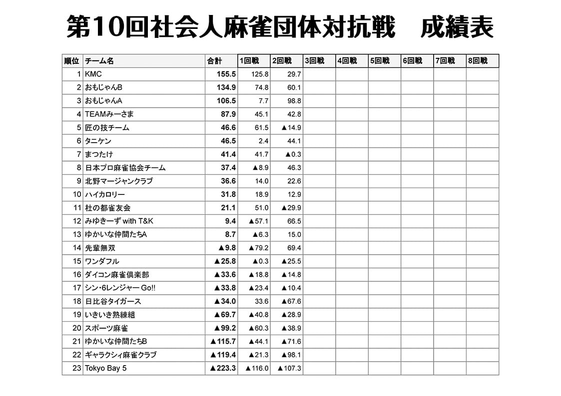 2回戦を終え、依然首位は変わらずKMCチームが主導権を握るも、ここで健康麻雀から知り合ったサークルチーム「おもじゃん」のA・B両チームが一気にポイントを伸ばし、KMCチームへ迫る。
