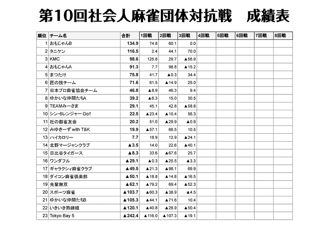 3回戦では上位陣が崩れ、2回戦まで3位だったおもじゃんBチームが首位になるも、ここで「タニケン」チームが2~3回戦で順調にポイントを加算し、首位に迫る。