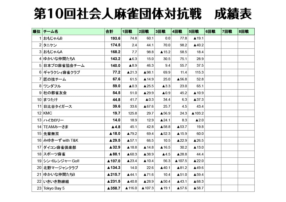 5回戦では上位チームが貯金を消費する展開になる。上位陣の顔ぶれは変わらないものの、ここで企業チーム「ギャラクシィ麻雀クラブ」が3人トップで一挙115ポイントを加算し6位へ急浮上する。