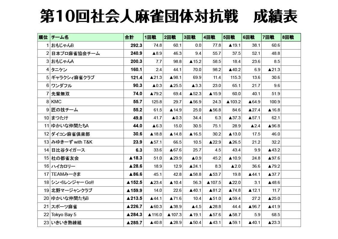 残り1回戦を残し、依然首位はポイントを伸ばし続けるおもじゃんBチーム。2位に日本プロ麻雀協会チームがしっかりと首位へ食らいつき、優勝を虎視眈々と狙う展開。また、7回戦にKMCチーム・山﨑勝彦さんが四暗刻の和了を成就させた。